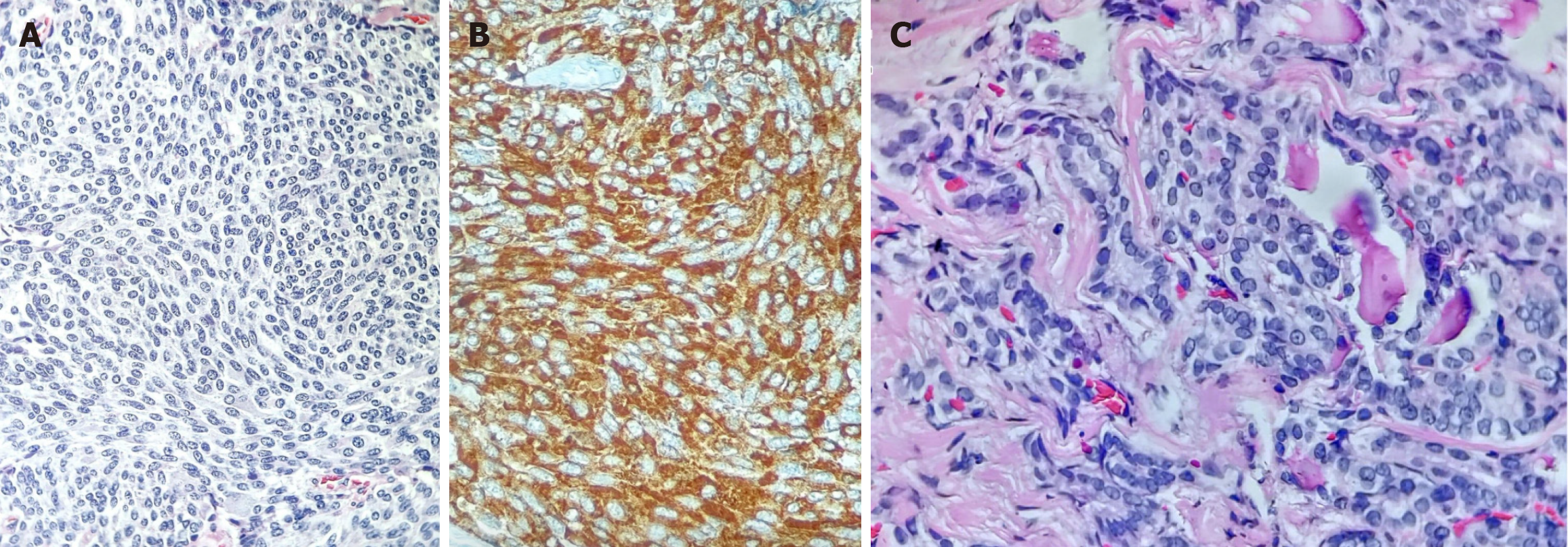 A: Medullary carcinoma of the thyroid hematoxylin and eosin 10 ×; B: Calcitonin immunohistochemical stain 10 ×; C: Micropapillary carcinoma of the thyroid hematoxylin and eosin 10 ×.