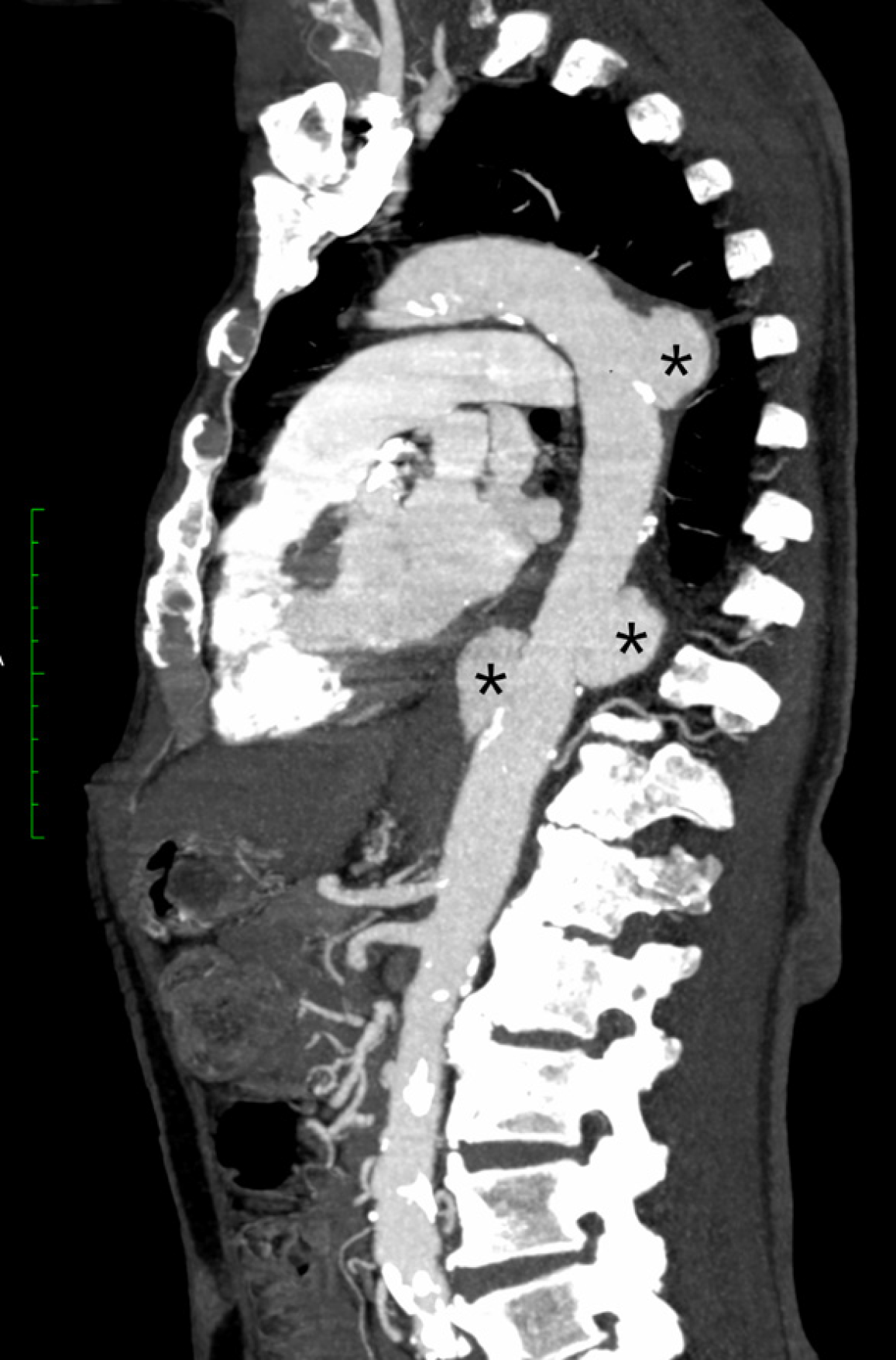 Figure 1 Sagittal view of computed tomography angiography of the thoracic aorta in maximum intensity projection showing three saccular aneurysms (*) along the descending thoracic aorta.