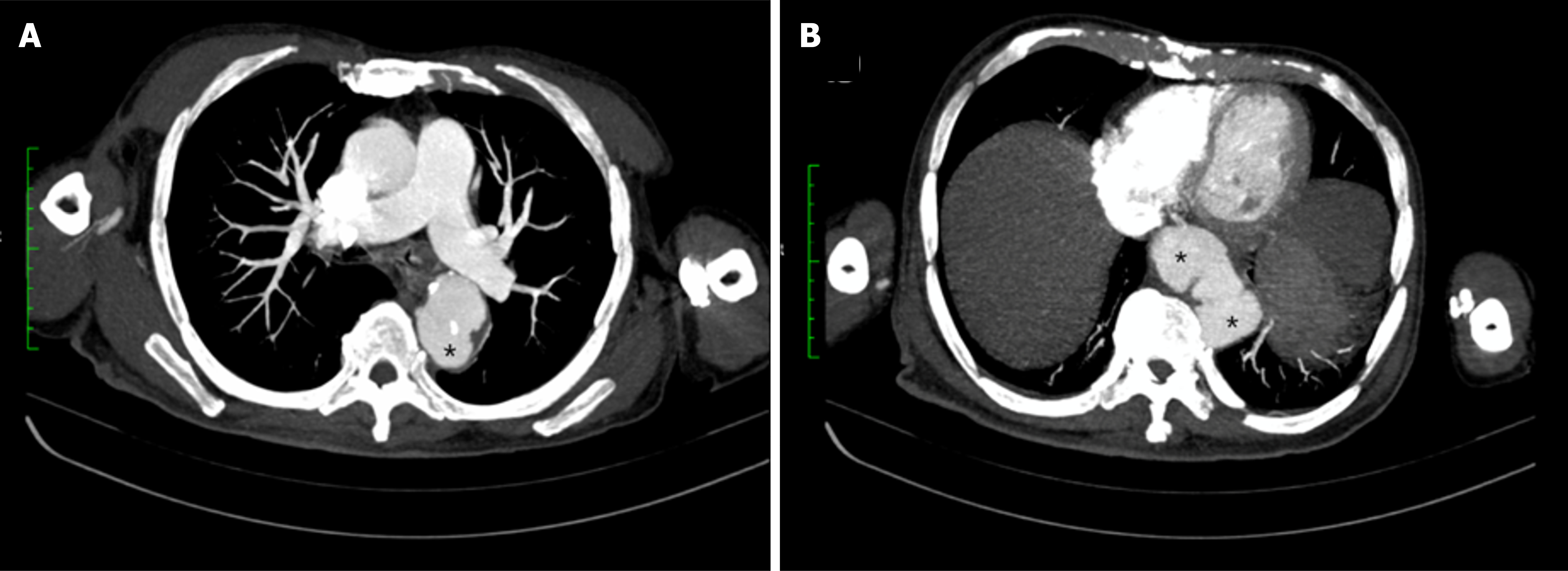 A: Upper thoracic axial section demonstrating a saccular aneurysm (*) arising from the descending thoracic aorta; B: Lower thoracic axial section showing additional saccular aneurysms (*) along the descending thoracic aorta.