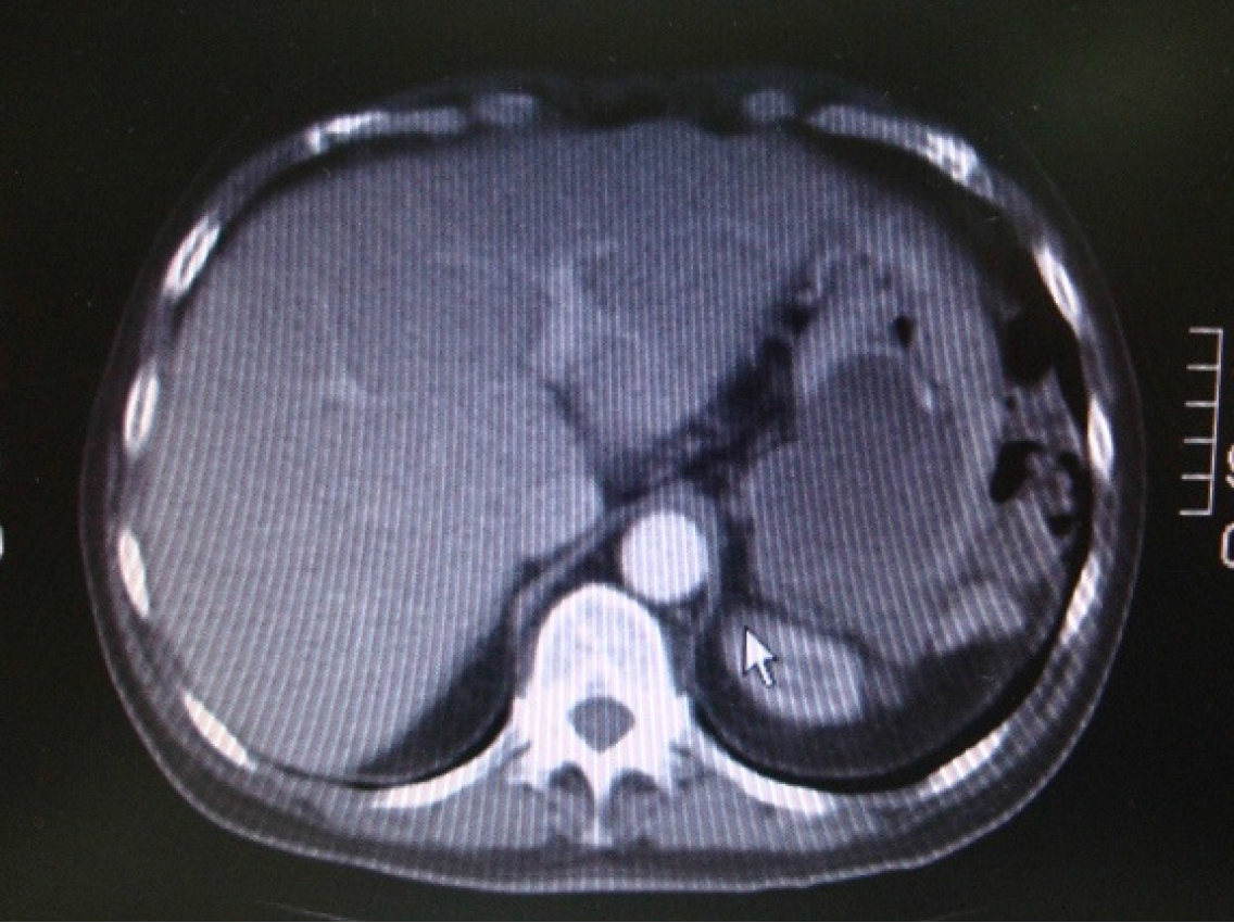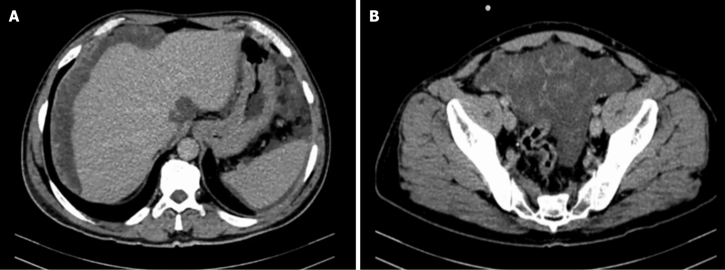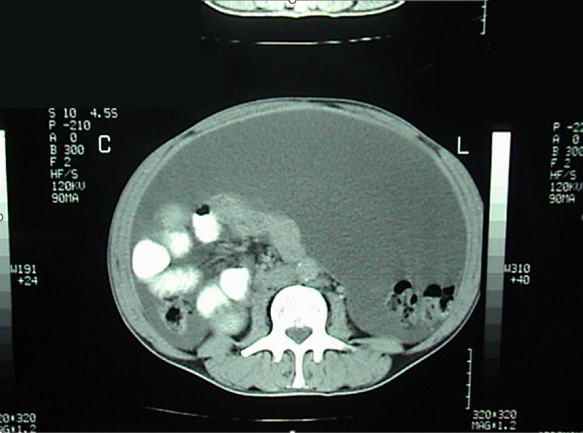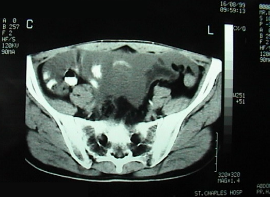 Figure 1 Enhanced computed tomography scan of the abdomen and pelvis showing a large amount of ascites.