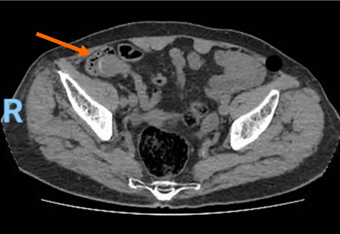 Figure 3 Computed tomography scan with intravenous contrast showing a well-circumscribed, low fluid attenuation tubular-shaped structure, seen in continuation with the base of the cecum, grossly measuring 64 mm × 29 mm × 28 mm, corresponding to the appendix (orange arrow).