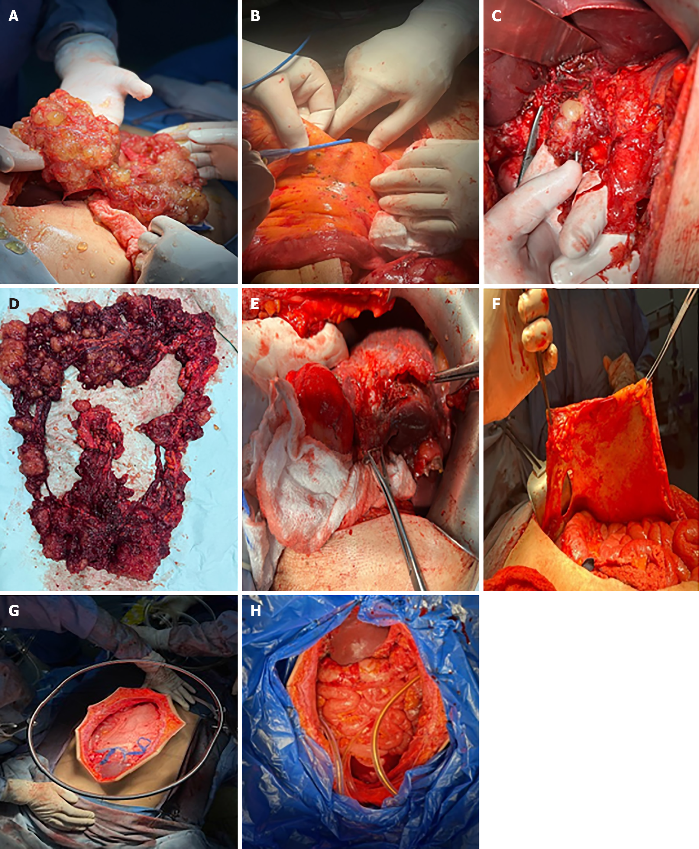 A: Multiple mucinous nodules around the abdomen along with thick omental caking; B: Small lesions less than 2 mm in the mesentery along with another in the Douglas; C: Large lesion in the hepatic pedicle invading the retro portal space and the hiatus of Winslow; D: Complete omentectomy; E: Excision of the hepatic pedicle nodule and hepatic capsule; F: Complete peritonectomy starting sub diaphragmatic right and left walls bilaterally reaching the Douglas; G: Coliseum technique with suspension of abdominal walls; H: Hyperthermic intraperitoneal chemotherapy done with mitomycin 10 mg/m2 in 3 L of 1.5% Dextrose peritoneal solution at 41 degree for 90 minutes.