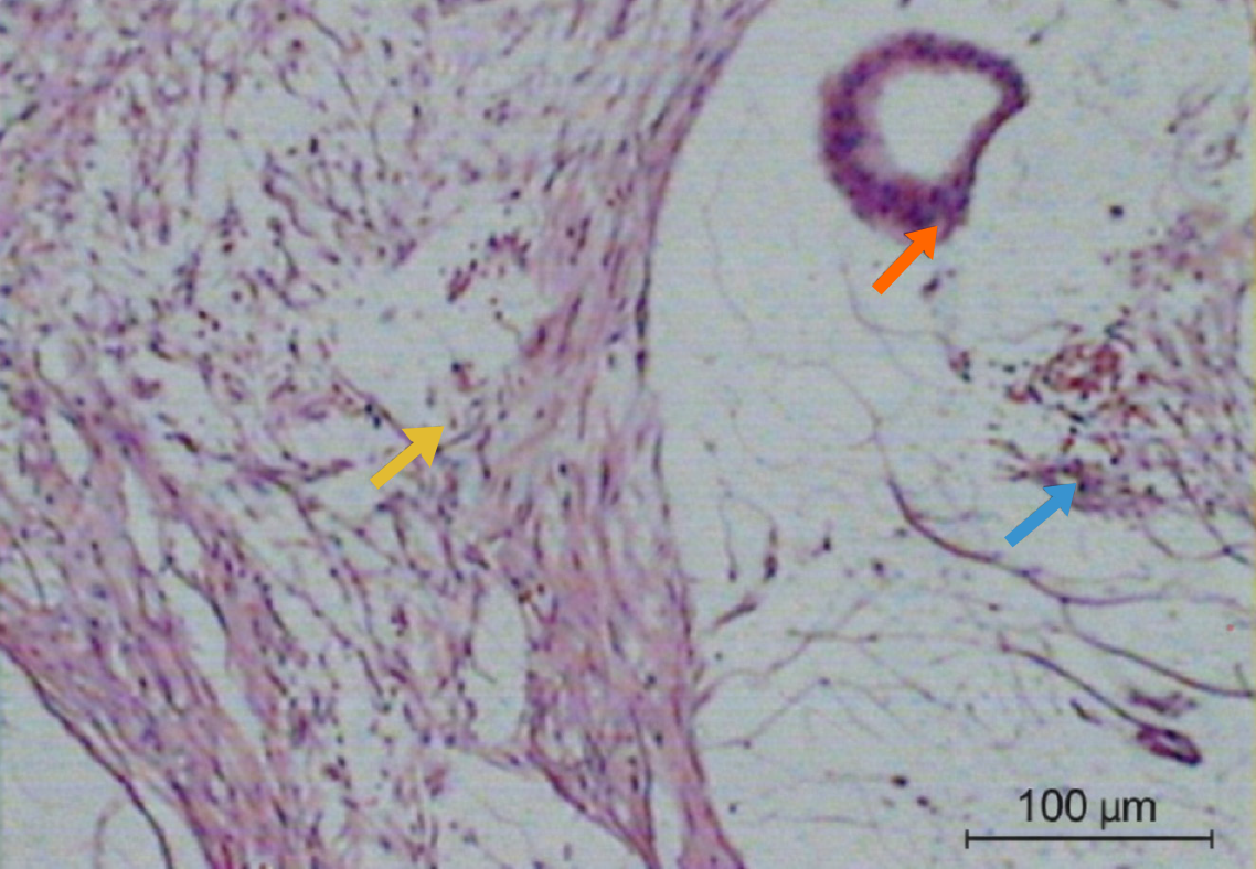 Yellow arrows indicate extracellular mucin pools; orange arrows highlight mucin-producing columnar epithelium; blue arrows demonstrate absence of cytologic atypia. Hematoxylin and eosin staining. Scale bar = 100 µm.