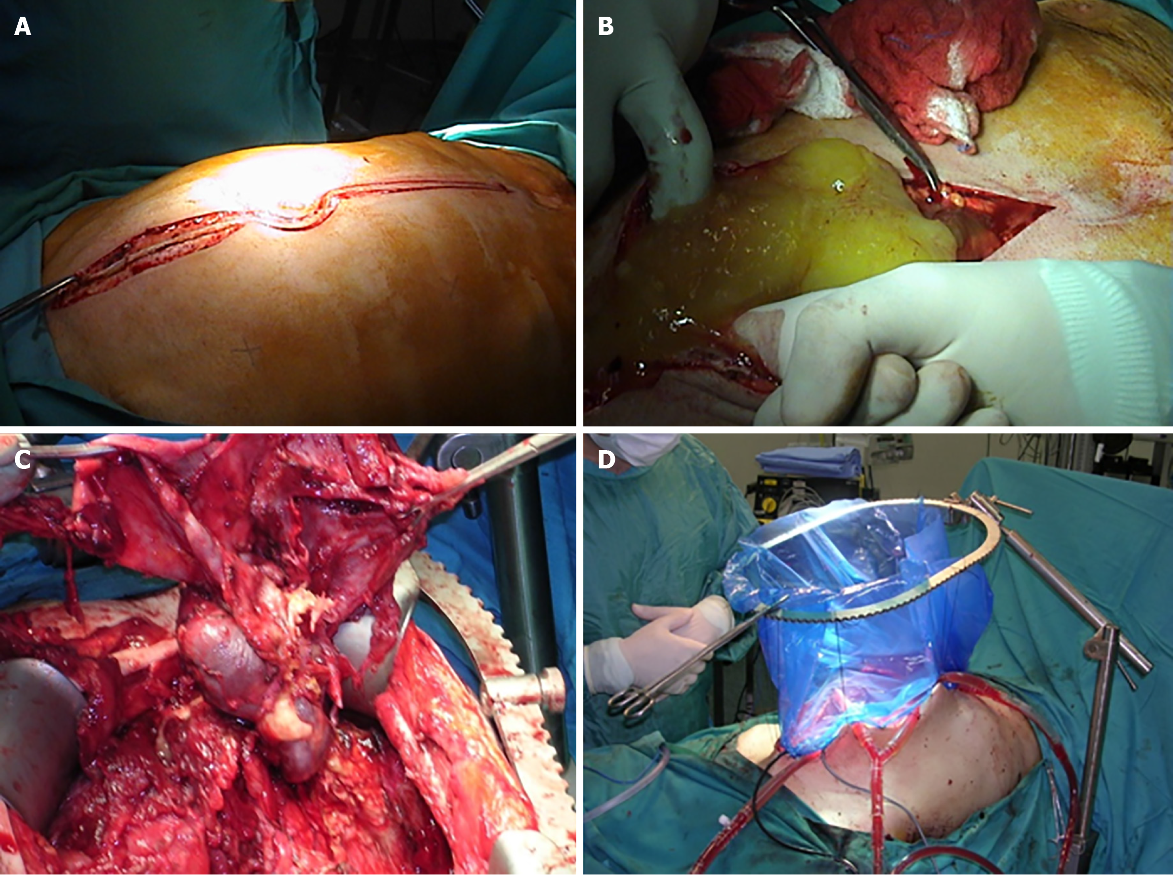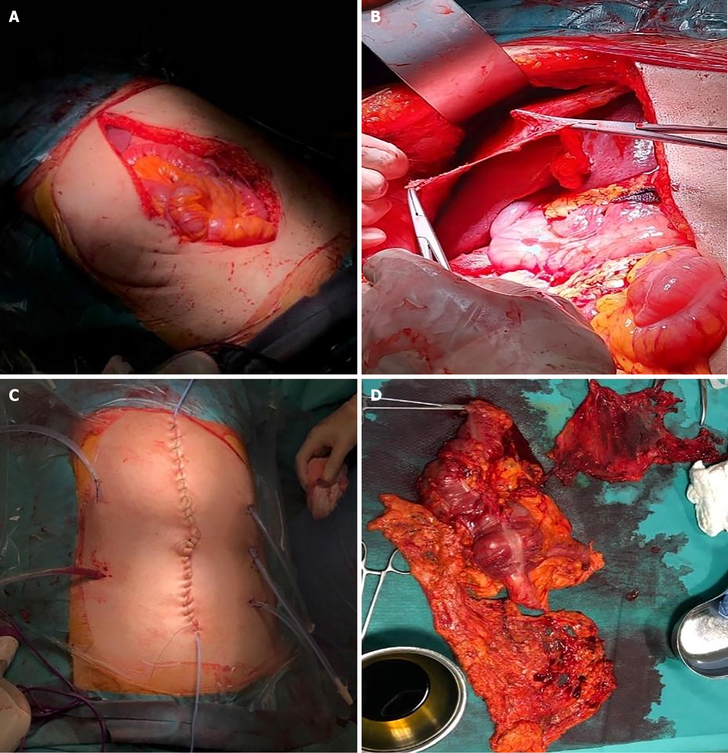 A: Inspection of the abdomen; B: Peritonectomy; C: Closed technique hyperthermic intraperitoneal chemotherapy; D: Specimen removed.