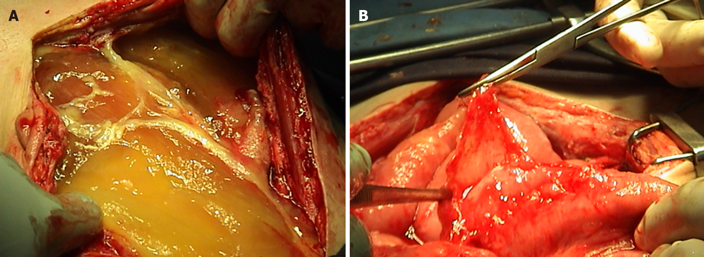 A: Gelatinous mucinous secretions released from the abdomen; B: Visceral peritonectomy.