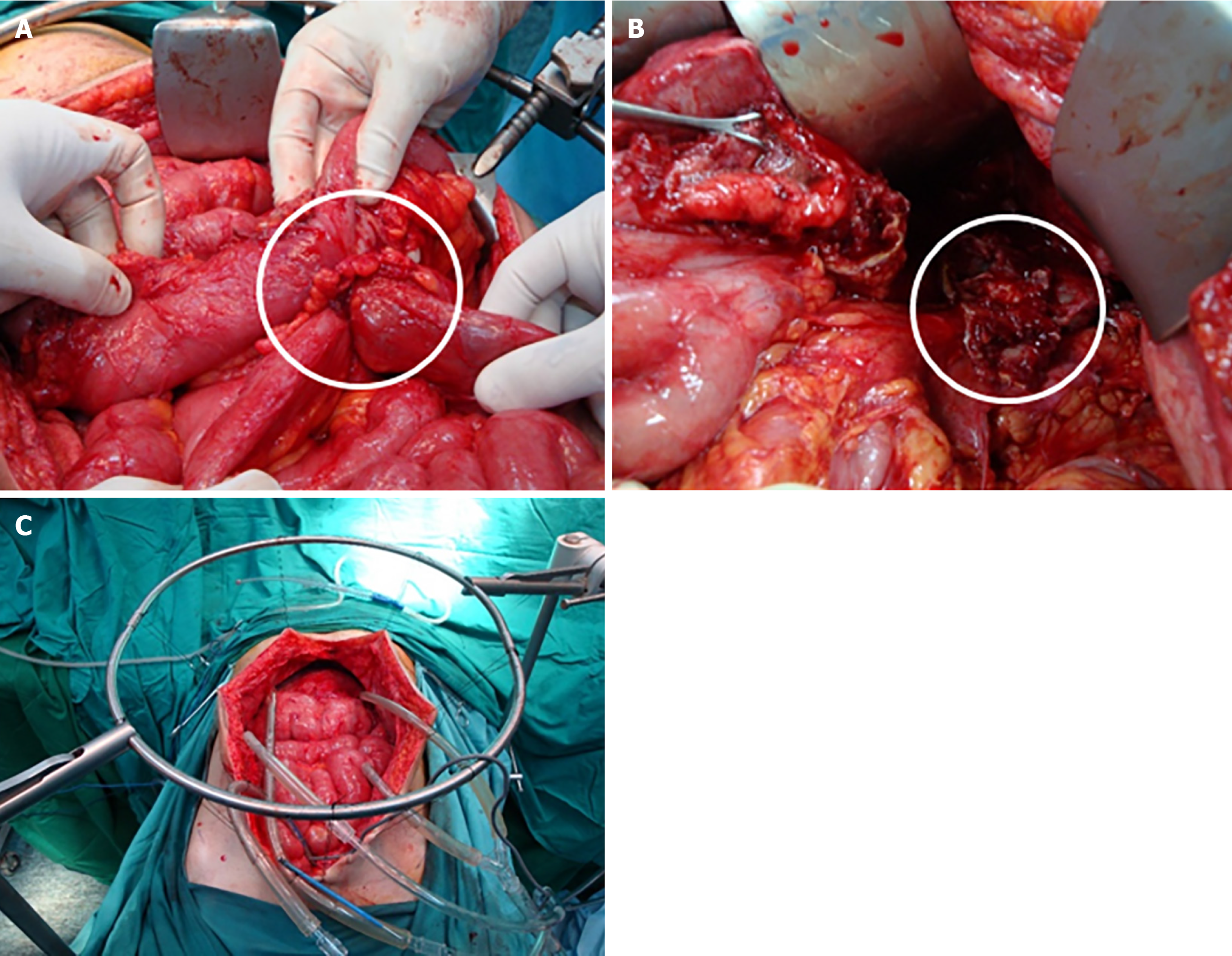 A: Retrogastric mass invading the left diaphragm (white circle); B: Colonic mass invading part of the small bowel (white circle); C: Hyperthermic intraperitoneal chemotherapy.