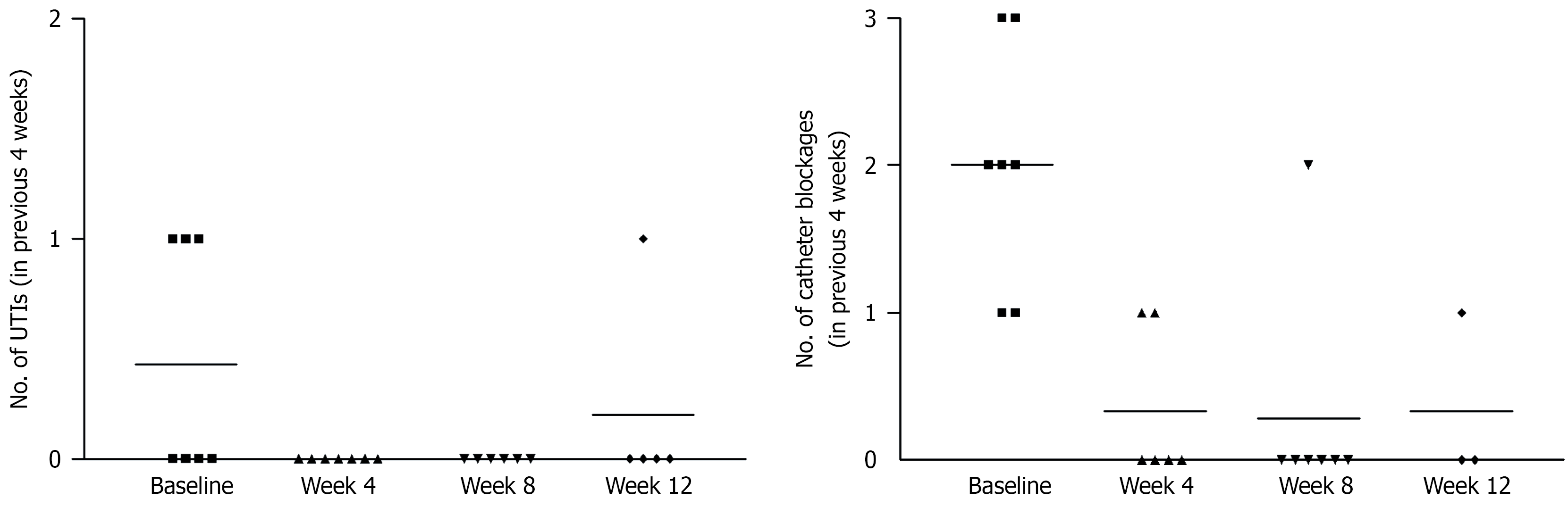 Figure 1 Graphs showing the number of urinary tract infections and catheter blockages experience during the trial period.