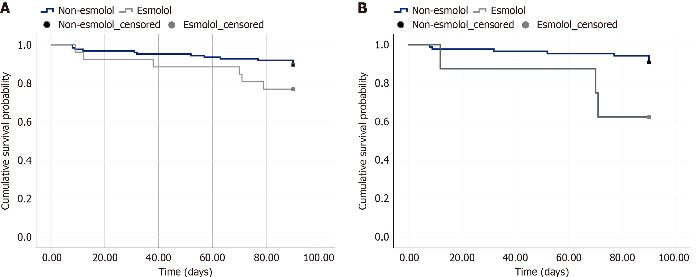 A: Kaplan-Meier 90-day survival curves for all patients undergoing intravenous thrombolysis (IT) for acute ischemic stroke (AIS). The 90-day survival rates in the esmolol-treated subgroup (76%) were non-significantly lower than those in the esmolol-untreated group (88%) (log-rank test; P = 0.077); B: Kaplan-Meier 90-day survival curves of the esmolol-treated and esmolol-untreated subgroups among patients without atrial fibrillation who underwent IT for AIS. The survival rates in the esmolol-treated subgroup (62%) were significantly lower than those in the esmolol-untreated subgroup (88%) (log-rank test; P = 0.009).