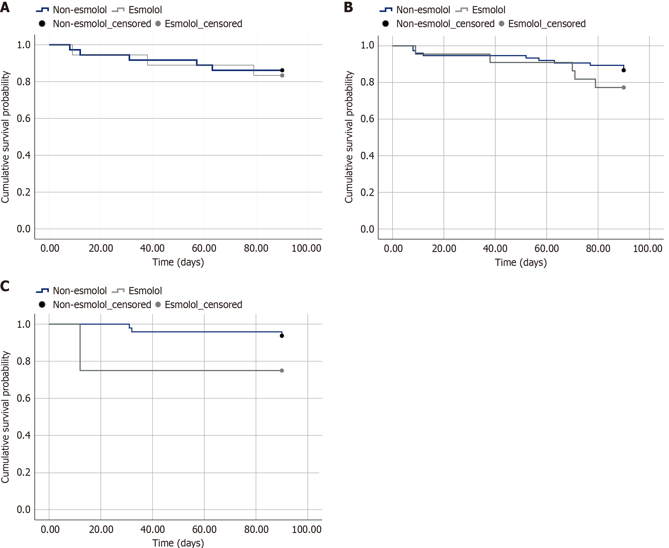 A: Kaplan-Meier 90-day survival curves of the esmolol-treated and esmolol-untreated subgroups among patients with atrial fibrillation who underwent intravenous thrombolysis (IT) for acute ischemic stroke (AIS). The survival rates were not significantly different between the esmolol-treated and esmolol-untreated subgroups (log-rank test; P = 0.807); B: Kaplan-Meier 90-day survival curves of the esmolol-treated and esmolol-untreated subgroups among patients with a history of hypertension who underwent IT for AIS. The survival rates were not significantly different between the esmolol-treated and esmolol-untreated subgroups (log-rank test; P = 0.23); C: Kaplan-Meier 90-day survival curves of the esmolol-treated and esmolol-untreated subgroups among patients without a history of hypertension who underwent IT for AIS. The survival rates were not significantly different between the esmolol-treated and esmolol-untreated subgroups (log-rank test; P = 0.13).
