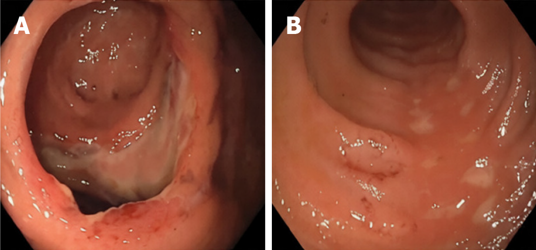 A: Localized ulceration at the ileocecal valve corresponding to the impaction site; B: Focal terminal ileal ulceration secondary to prolonged catheter contact, without perforation or active bleeding.