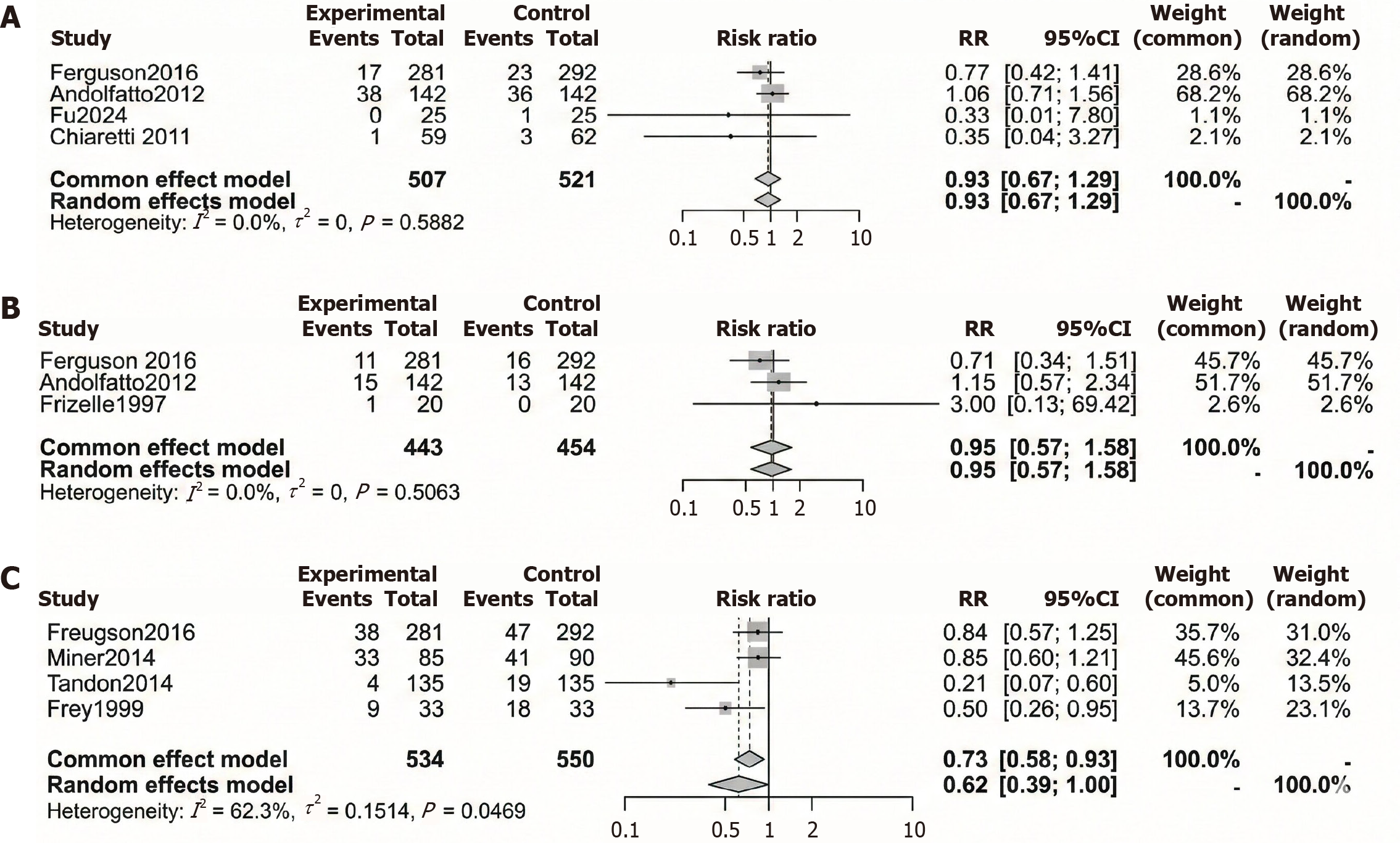 A: Risk ratio (RR) for desaturation; B: RR for apnea; C: RR for respiratory intervention. CI: Confidence interval.