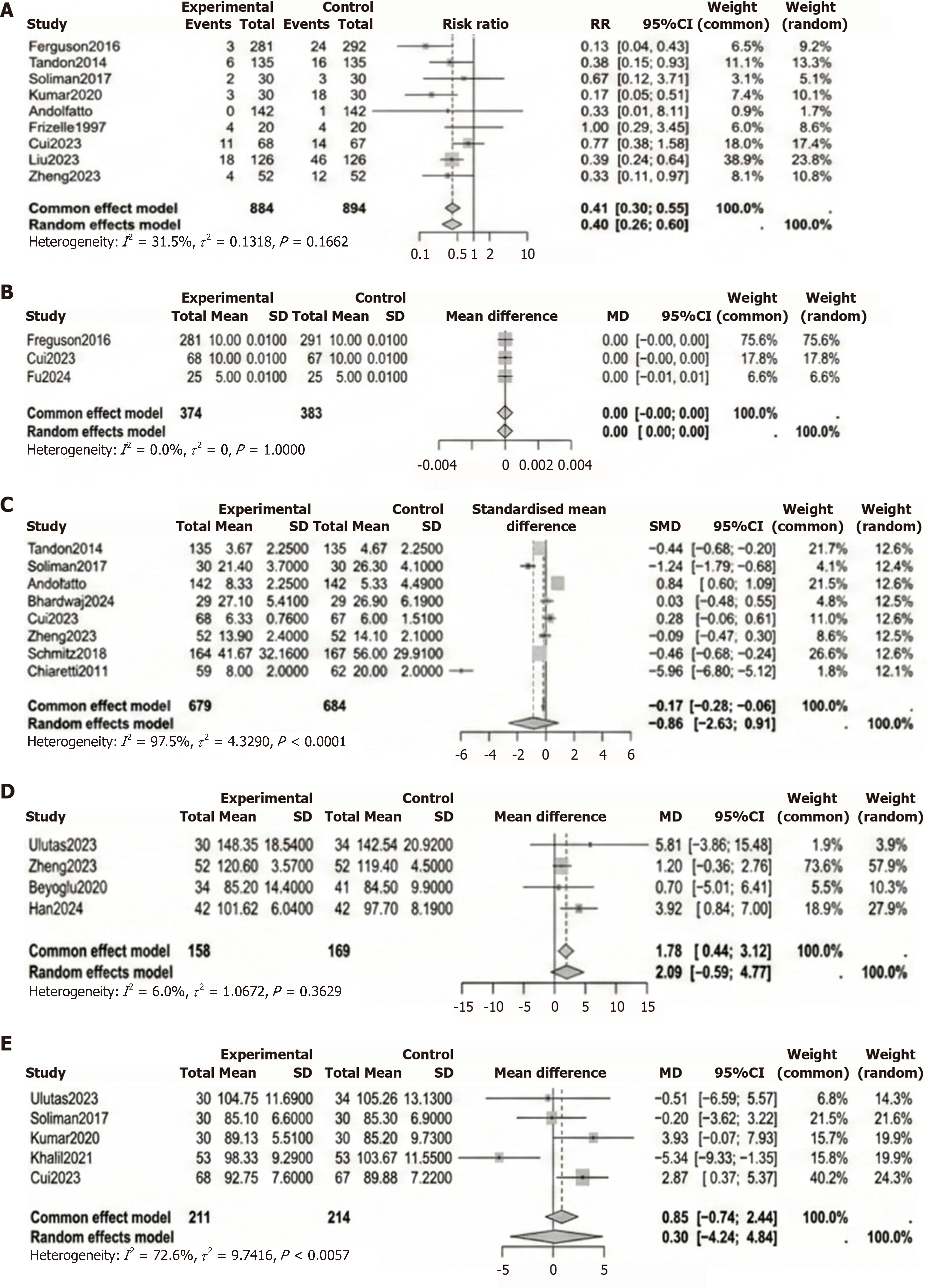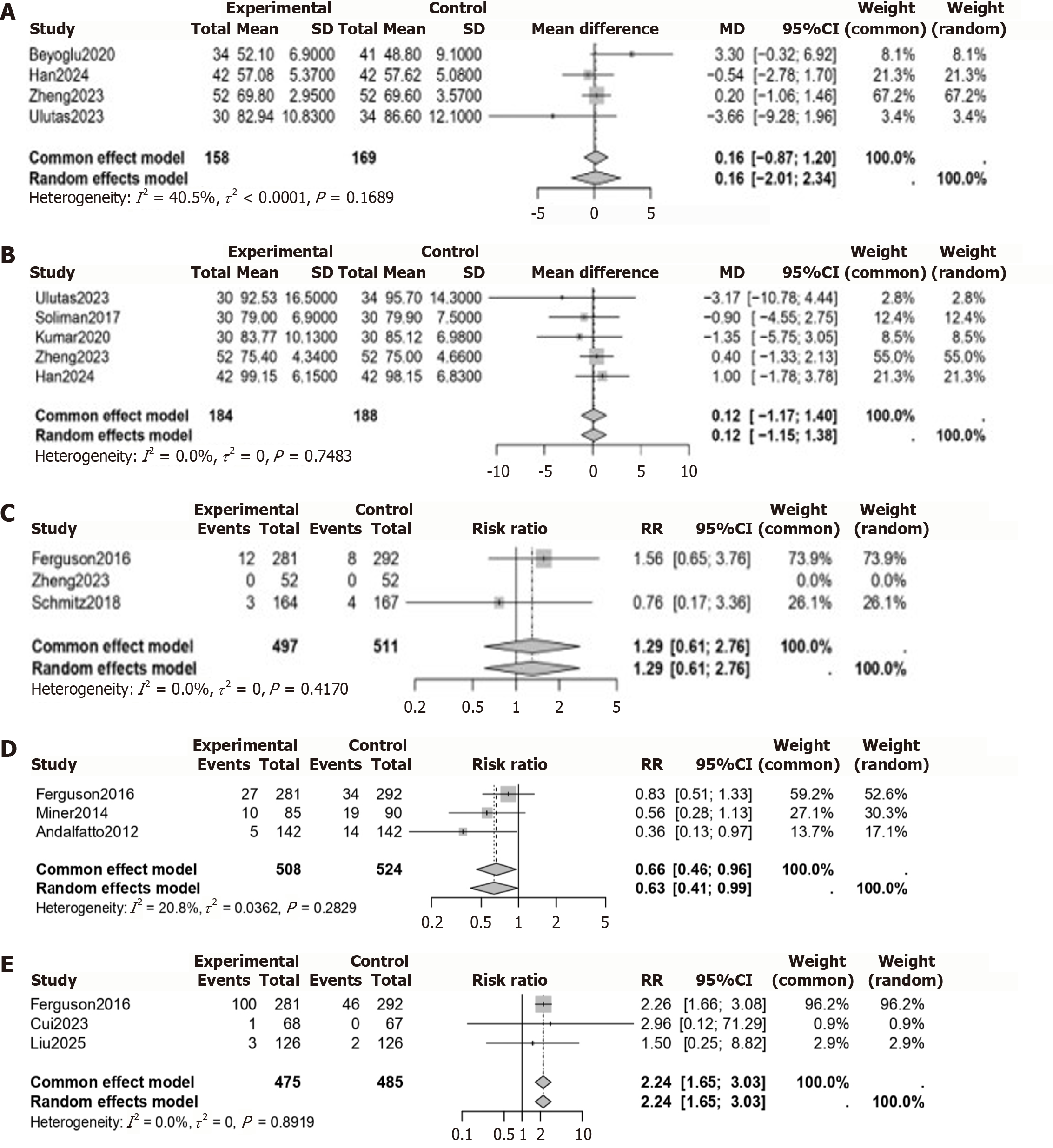 A: Risk ratio (RR) for hypotension; B: Mean difference (MD) in patient satisfaction; C: Standardized mean difference in recovery time; D: MD in systolic blood pressure; E: MD in mean arterial pressure. CI: Confidence interval.