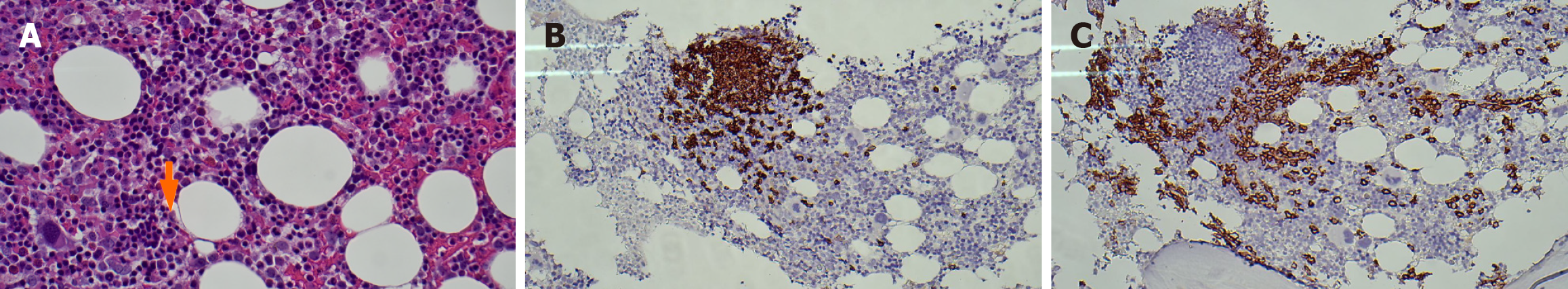 A: Hyper-normocellular marrow with 5% plasma cells (orange arrow) and mild plasmacytosis; B: Aggregation of mature B-cells on CD20 immuno-histochemical stains; C: Rimmed clusters of medium to large plasma cells on CD 138 (× 20 magnification).