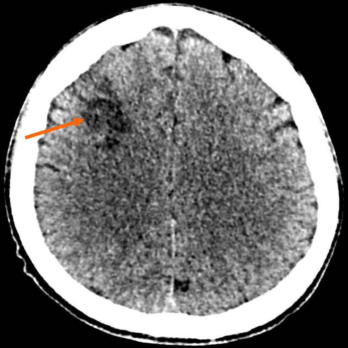 Non-enhanced computed tomography brain (axial view) with well-defined hypodensity at right fronto-parietal lobe, suggestive of a chronic watershed region infarct (orange arrow).