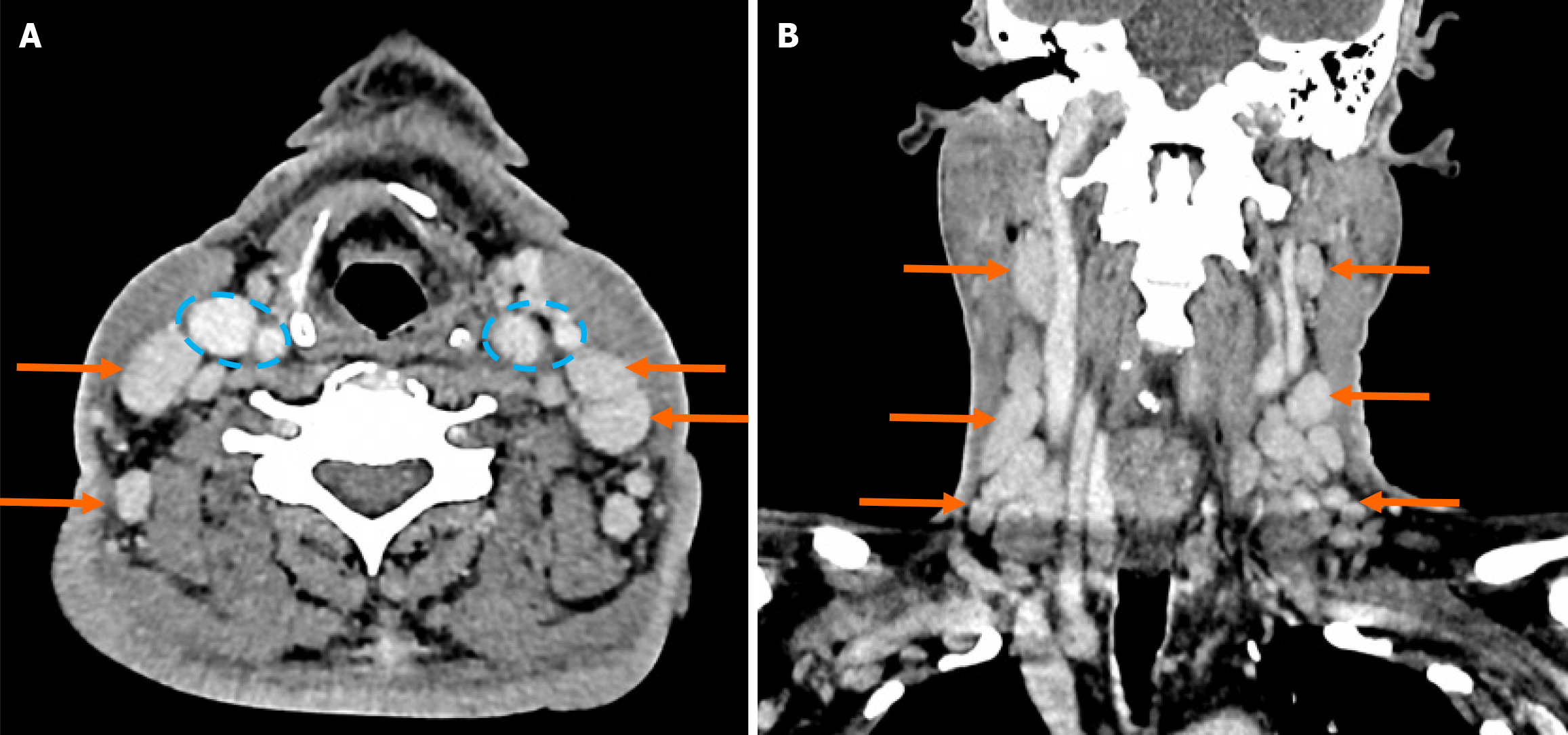 A: Axial computed tomography (CT) with multiple enlarged cervical and supraclavicular lymph nodes (arrows) and patent bilateral carotid and jugular vessels are highlighted within the blue dotted lines; B: Sagittal CT with similarly enlarged nodes as mentioned (arrows).