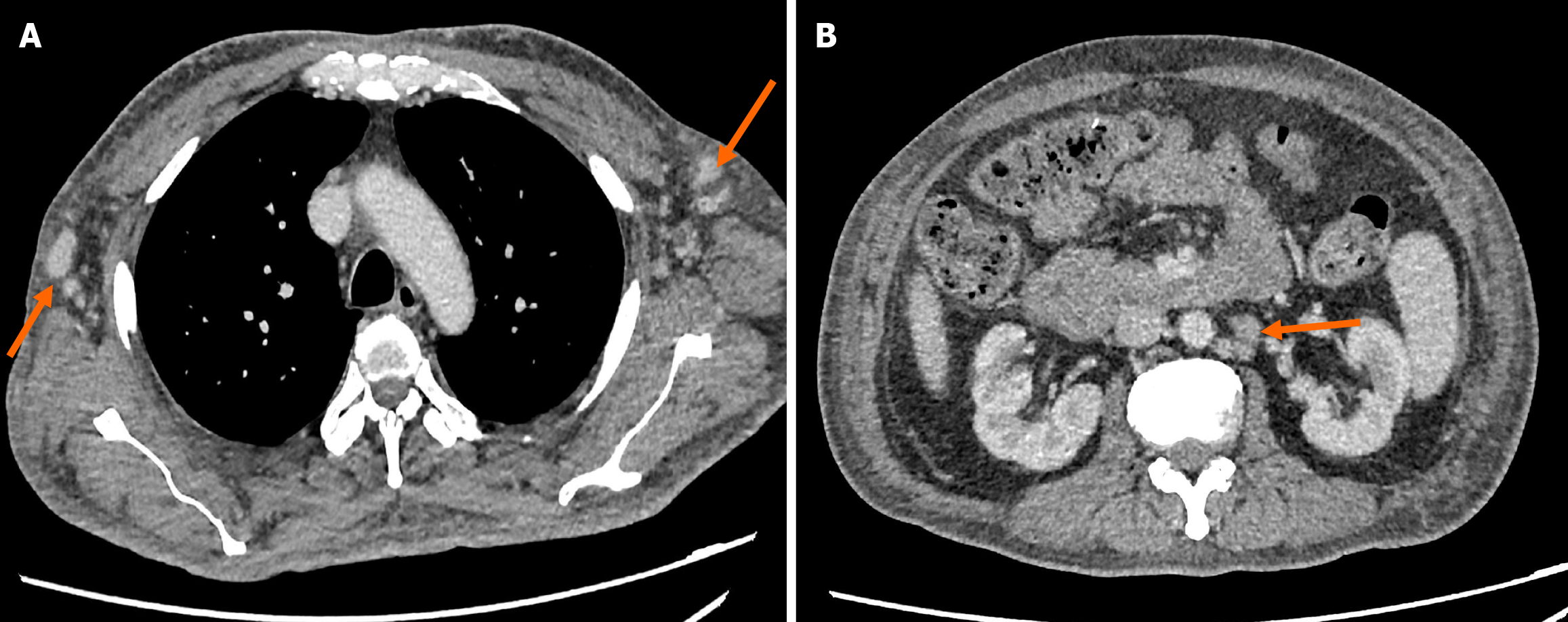 A: Axial view depicting enlarged lymph nodes at bilateral axillary region (arrows); B: Axial view at abdominal level showing lymphadenopathy at paraaortic region (arrow).