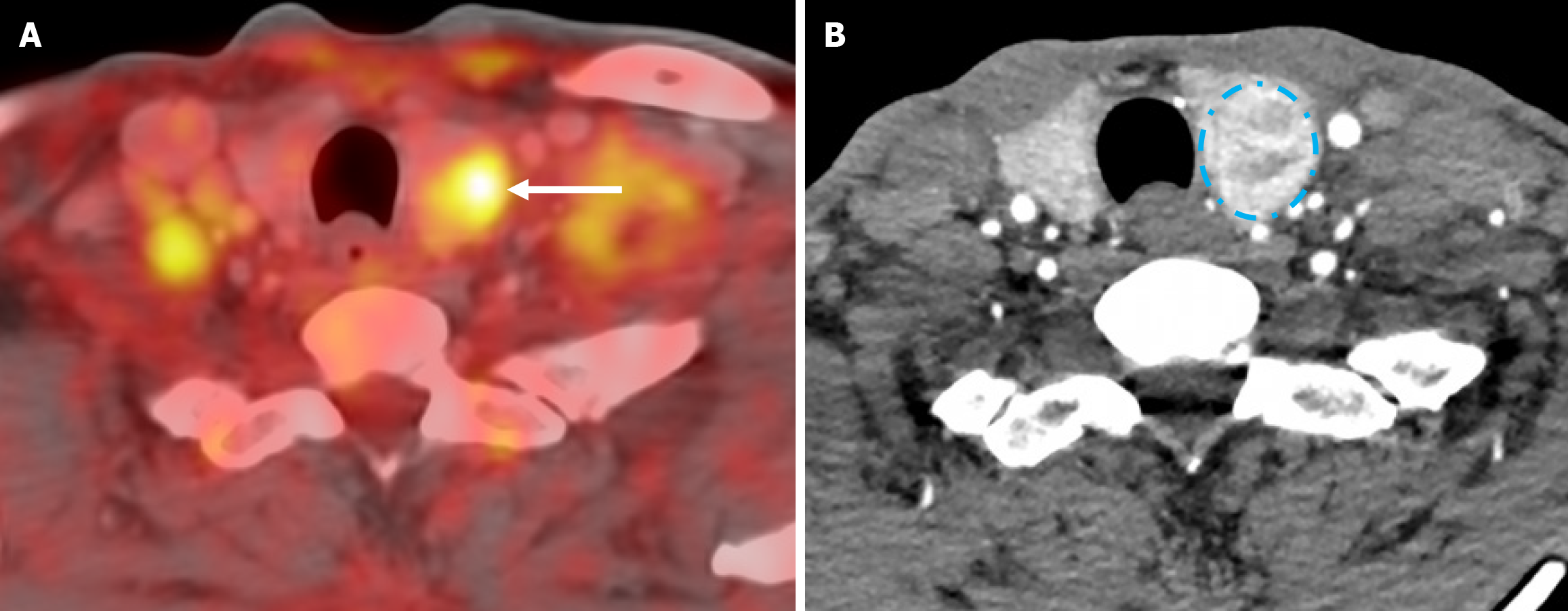 A: Axial view showing hypermetabolic left thyroid nodule (arrows); B: Contrast enhanced computed tomography neck axial showing heterogeneously enhancing left thyroid nodule.