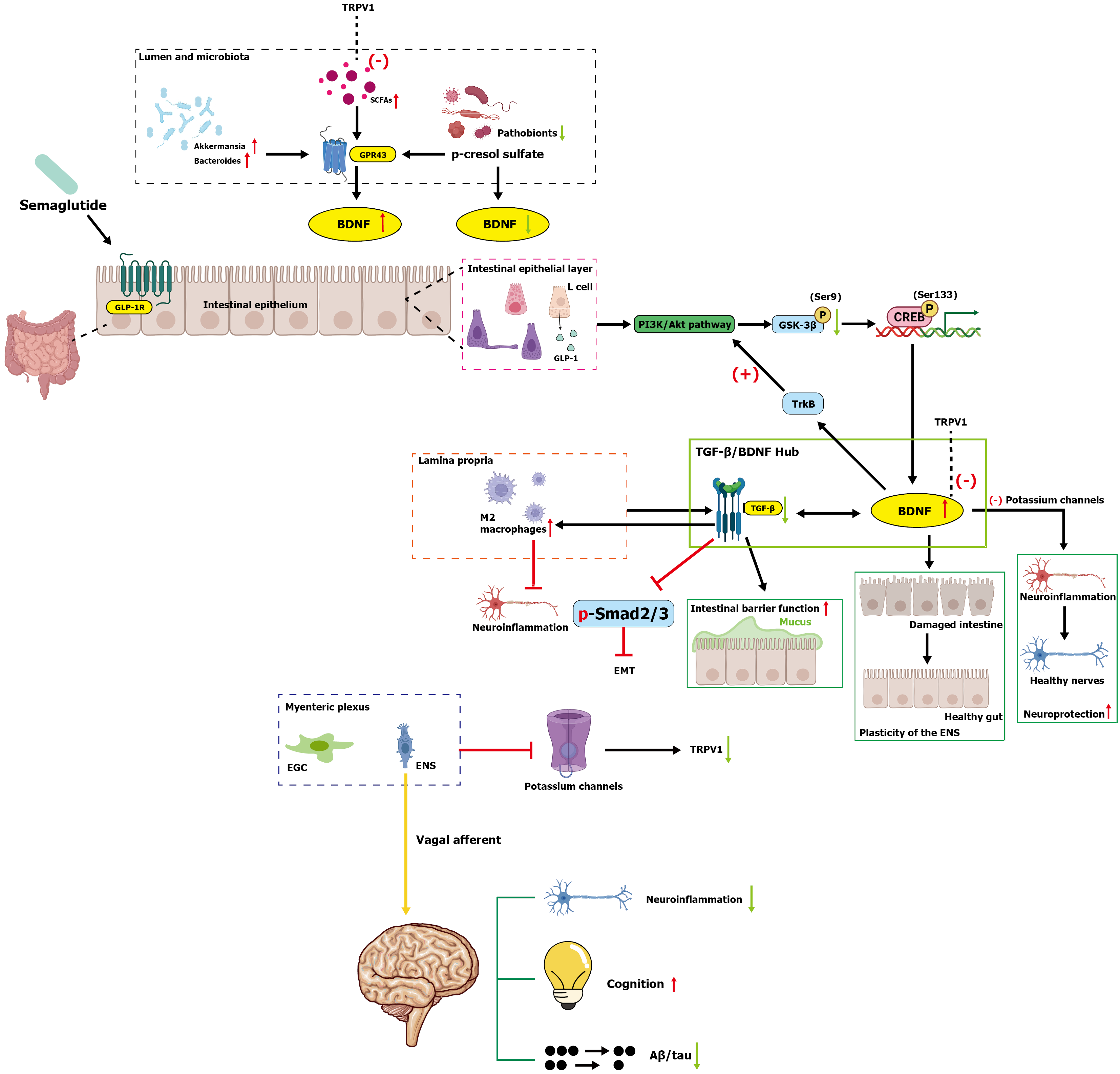 This mechanism diagram illustrates the core mechanism of semaglutide regulating the gut-brain axis: By activating the intestinal epithelial glucagon-like peptide-1 receptor, it inhibits glycogen synthase kinase-3β via the phosphatidylinositol 3-kinase/protein kinase B pathway to promote brain-derived neurotrophic factor transcription, while modulating the transforming growth factor-β/Smad pathway to improve inflammation and barrier function. Brain-derived neurotrophic factor exerts neuroprotective effects through tropomyosin receptor kinase B, remodeling enteric nervous system plasticity. In addition, the drug reshapes gut microbiota (e.g., Akkermansia, Bacteroides), increases short-chain fatty acids, inhibits harmful metabolites, indirectly modulates transient receptor potential vanilloid 1 and potassium channels, alleviates neuroinflammation, and connects to cognition via the vagal afferent pathway, achieving dual metabolic and neuroprotective effects. TRPV1: Transient receptor potential vanilloid 1; SCFA: Short-chain fatty acids; GPR43: G protein-coupled receptor 43; BDNF: Brain-derived neurotrophic factor; GLP-1R: Glucagon-like peptide 1 receptor; GLP-1: Glucagon-like peptide 1; PI3K/Akt: Phosphatidylinositol 3-kinase/protein kinase B; GSK-3: Glycogen synthase kinase 3; CREB: Cyclic adenosine monophosphate-response element-binding protein; TrkB: Tropomyosin receptor kinase B; TGF: Transforming growth factor; EMT: Epithelial-mesenchymal transition; EGC: Enteric glial cell; ENS: Enteric nervous system.
