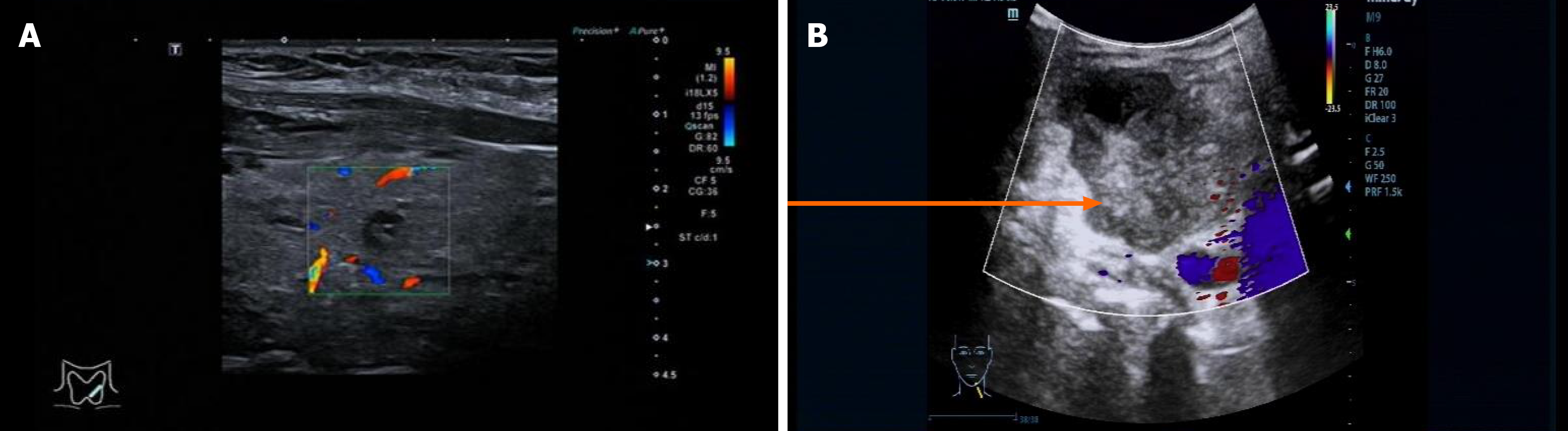 With suspected internal jugular vein involvement, Kobayashi et al[14] have recommended thyroid and vascular ultrasonography as the first choice for assessment, while Dikici et al[9] suggested further examinations with CT, magnetic resonance imaging (MRI), CTA, or CTV for more detailed evaluation. After these tests, Xiong et al[15] stated that the gold standard for tumor characterization remains fine needle aspiration biopsy. If the fine needle aspiration yields unsatisfactory results, immunohistochemistry should be conducted, and if necessary, a second fine needle aspiration or core needle biopsy should be performed[16].