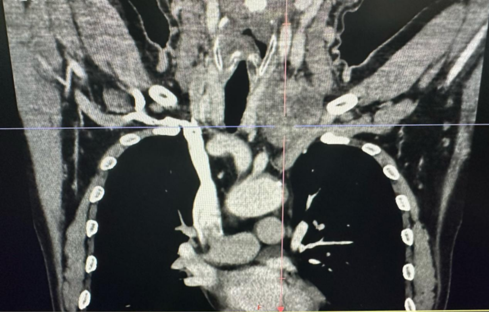 Conducted meticulous preoperative assessments including: Thyroid function evaluation (TSH, free T4, thyroglobulin levels); cardiopulmonary function testing (echocardiography, pulmonary function tests); Laryngeal examination with preoperative vocal cord mobility assessment via flexible laryngoscopy; Contrast-enhanced CT angiography with 3D vascular reconstruction for anatomical localization; Postoperative Rehabilitation Program.