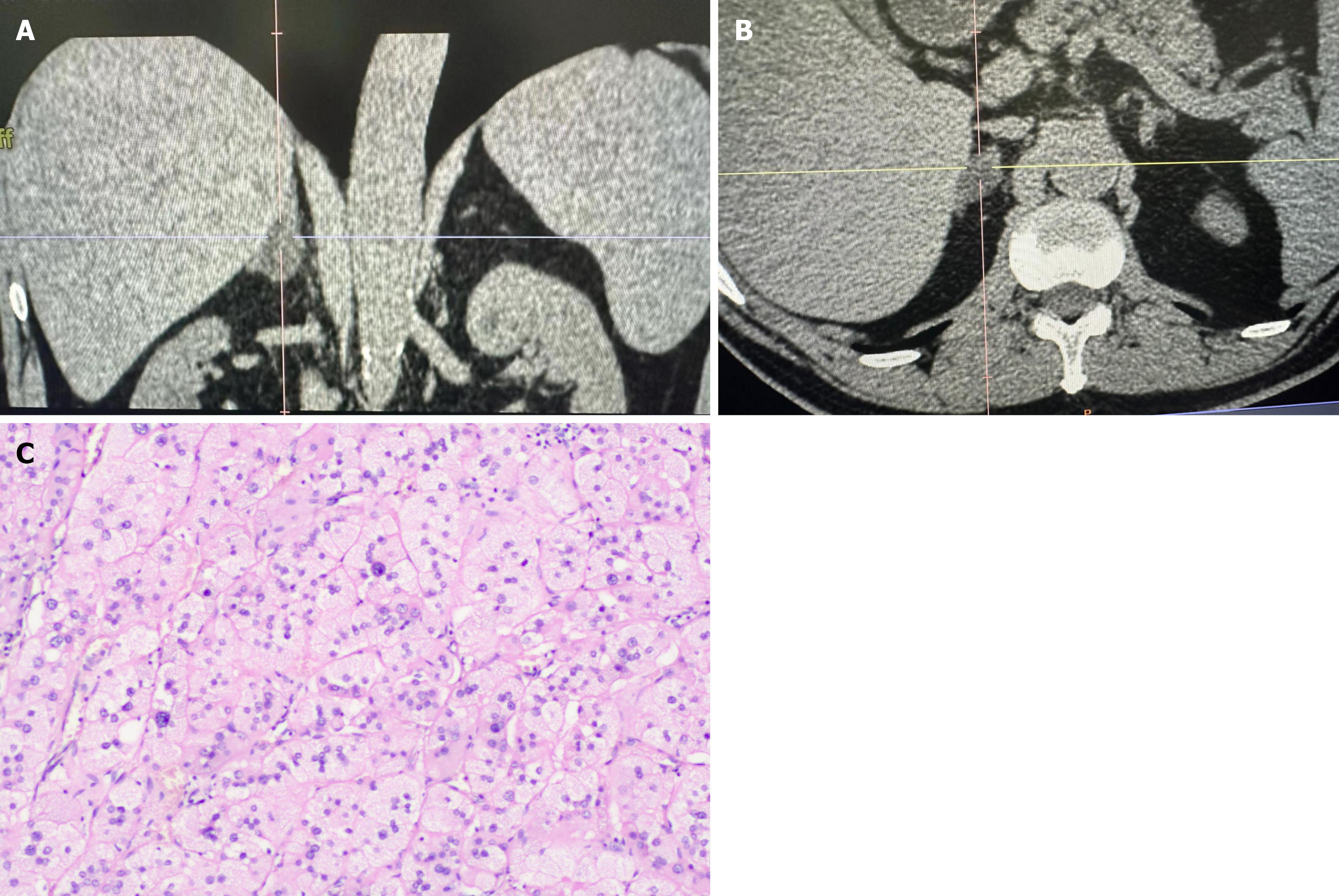 The patient has a history of hypertension and developed severe hypokalemia (2.43 mmol/L) and hypertension upon admission, with blood pressure fluctuating between 174-205/97-135 mmHg. Potassium supplementation was administered, but serum potassium levels remained between 2.43-2.78 mmol/L without any clinical symptoms of hypokalemia. Preoperative multidisciplinary consultation discussed the surgical plan. Due to multiple abnormal hypertension markers, including aldosterone (upright) at 1308.2 pg/mL, aldosterone (supine) at 998.0 pg/mL, angiotensin II (supine) at 127.9 pg/mL, ACTH (8 hours) at 51.9 pg/mL, and adrenal computed tomography (CT) revealing a right adrenal tumor, the patient was diagnosed with primary hyperaldosteronism.