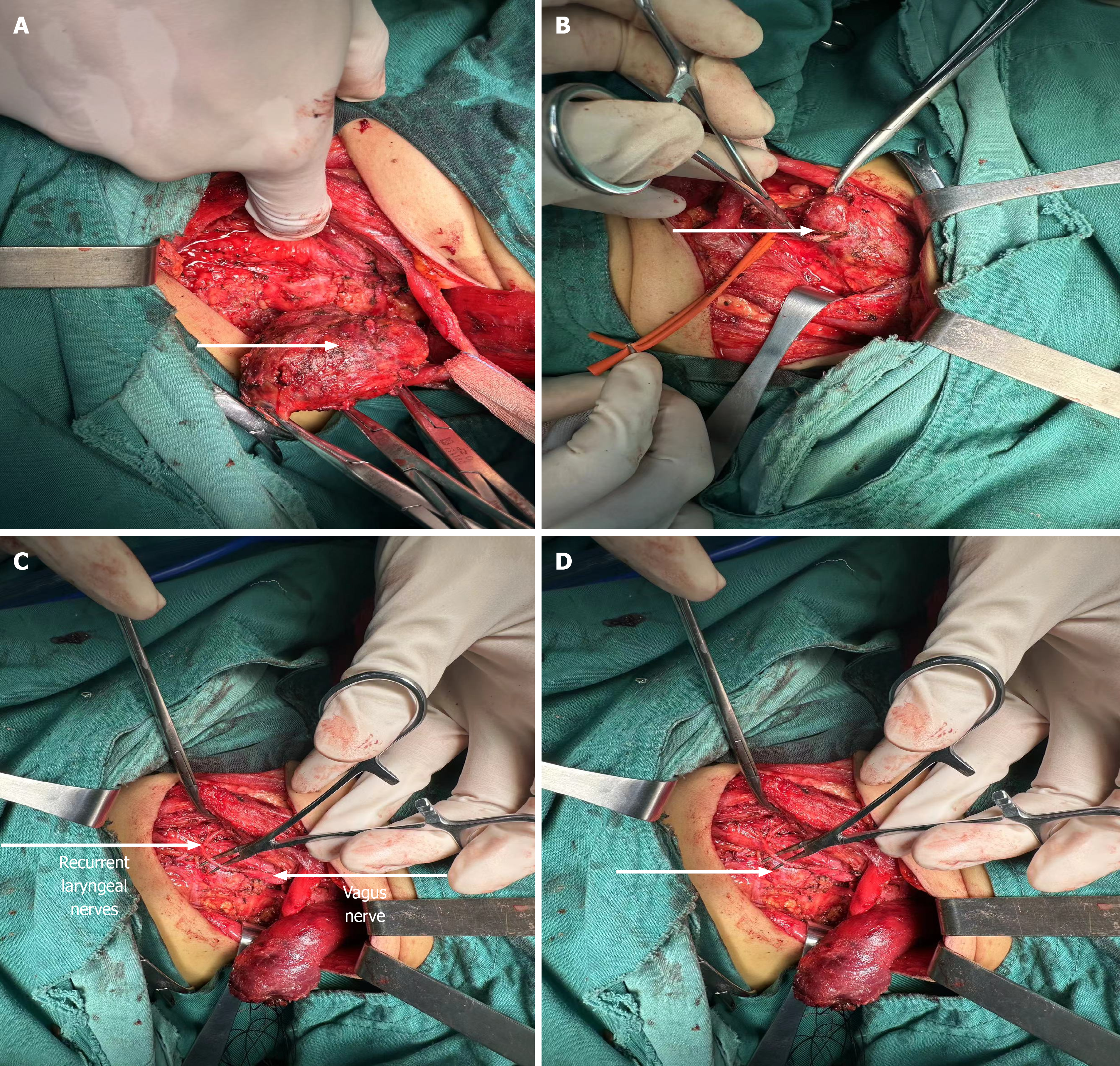 PTC commonly causes hoarseness when invading the RLN[1]. In this case, preoperative laryngoscopy revealed that the left vocal cord was fixed and paralyzed. During surgery, however, we observed that the left RLN was intact, and the hoarseness was caused by an invasion of the left vagus nerve. Wang and Yang[2] reported a poorly differentiated carcinoma invading the vagus nerve causing hoarseness; however, the authors did not report the treatment process. It is extremely rare for differentiated thyroid carcinoma to invade the vagus nerve and cause hoarseness. Kumar et al[3] reported a case of diffuse large B-cell lymphoma compressing the vagus nerve; the patient did not receive further treatment. An irreparable nerve may lead to lifelong hoarseness and affect other systems. In this case, we considered that the patient had a long-standing unilateral vagus nerve involvement, and other organ functions had adapted, with no obvious symptoms other than hoarseness. During the surgery, we used nerve monitoring equipment to stimulate the left recurrent laryngeal and vagus nerves. Following stimulation, the signals were lost, indicating severe damage to the left vagus-RLN pathway, making it impossible to perform vagus nerve resection and end-to-end anastomosis. Therefore, we performed an end-to-end anastomosis between the left RLN and left vagus nerve. This surgical approach is exploratory, with unconfirmed clinical efficacy. Saxe et al[4] emphasized the importance of intraoperative nerve monitoring (IONM) during thyroid and parathyroid surgery. IONM is indispensable for major thyroid procedures, as routinely employed in our department. During surgery, IONM significantly reduces the risk of injury to the RLN, superior laryngeal nerve, and vagus nerve, thereby minimizing postoperative vocal alterations caused by neural impairment. Furthermore, it substantially lowers the incidence of bilateral RLN injury, a critical complication that may lead to life-threatening respiratory distress. Vagus nerve involvement in PTC impairments (due to direct compression/infiltration) laryngeal dysfunction (most common and significant): Unilateral vocal fold paralysis: Hoarseness, weak phonation, ineffective cough (impaired sputum expulsion), significantly increased aspiration risk (due to laryngeal sensory deficit + glottic insufficiency). Bilateral vocal fold paralysis (rare but critical): Can lead to acute airway obstruction, requiring emergency tracheostomy. Long-term Consequences: Chronic voice impairment, recurrent lower respiratory tract infections (aspiration pneumonia), severe decline in quality of life.