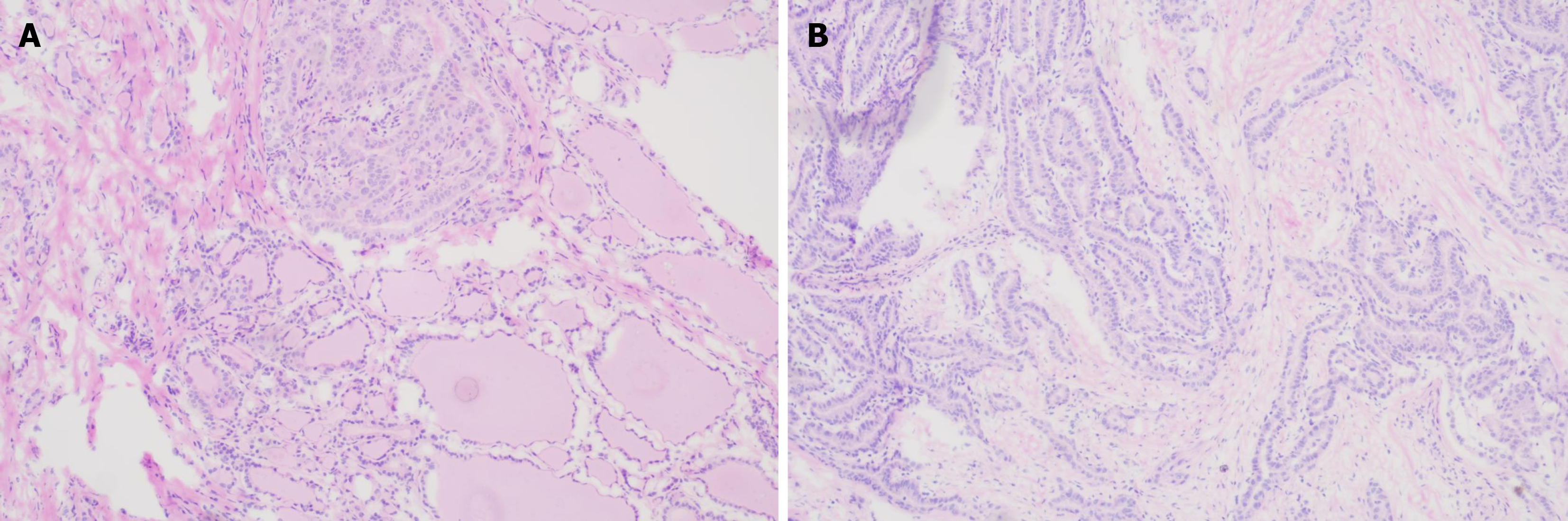 In this case, the pathological report of the left thyroid showed no malignant tumor components, while the right thyroid papillary carcinoma had a diameter of < 1 cm. No cancer metastasis was observed in the right central group lymph nodes, and only minimal metastasis was detected in the left cervical lymph nodes.