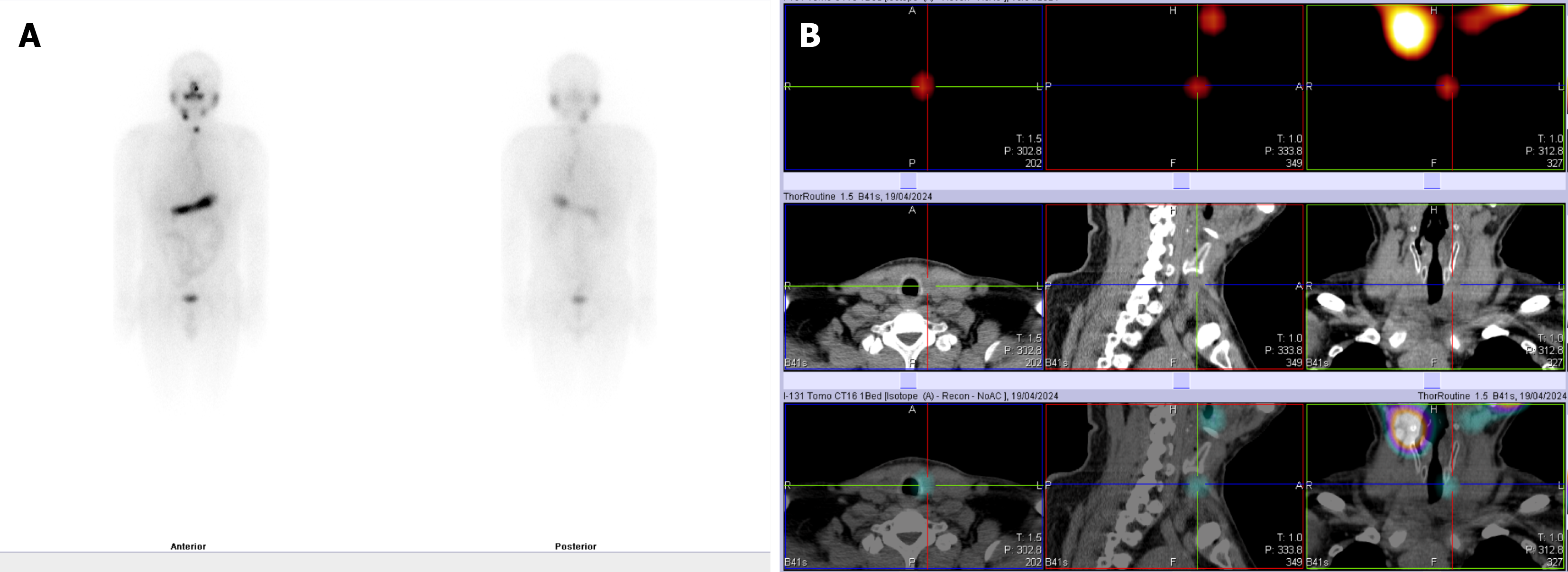Postoperatively, the patient’s heart rate and blood pressure remained stable, and there were no significant abnormalities in diet or gastrointestinal function. He patient experienced transient hypoparathyroidism, which was treated with calcium supplements for five days. Subsequent parathyroid hormone and serum calcium levels returned to normal. The patient received radioactive iodine (I-131) treatment and TSH suppression therapy postoperatively (Figure 7).