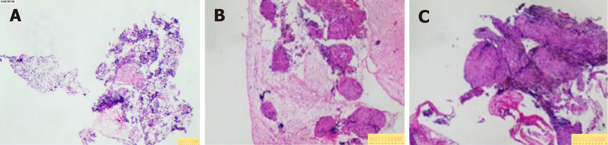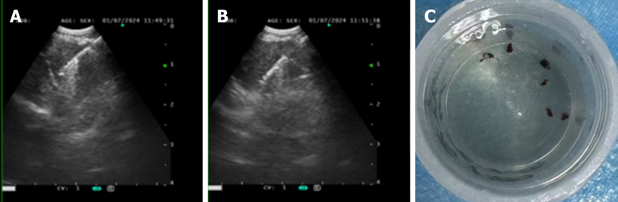 Case 2: Initial diagnostic evaluations revealed thrombocytopenia (55 × 109/L) with normal coagulation parameters, biochemistry, tumor markers, and negative antinuclear antibodies. Pulmonary function tests indicated mild obstructive ventilatory impairment, while a nasopharyngeal biopsy demonstrated lymphoid hyperplasia. There was no remarkable abnormal phenomenon in fundoscopic examination, and a bone marrow biopsy performed on December 17, 2024, showed partial megakaryocyte maturation arrest without atypia or fibrosis. On December 19, 2024, bronchoscopy with bronchoalveolar lavage fluid analysis revealed a CD4/CD8 ratio of 4.68 under general anesthesia. Concurrently, EBUS-TBNA using an Olympus 21-G needle (three passes) and EBUS-TBFB were performed on subcarinal (station 7) lymph nodes via the same puncture site, adhering to the protocol described in Case 1. The EBUS-TBFB yielded specimens with a diameter of at least 3 mm. In accordance with the histopathological examination, non-caseating granulomas without necrosis were identified (Figure 2B and C), and serum angiotensin-converting enzyme levels were elevated at 51.1 U/L.