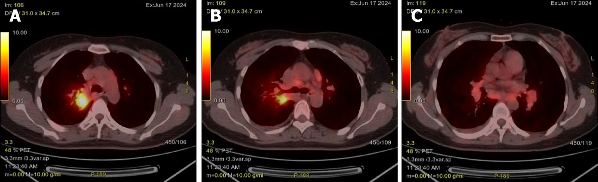 Case 1: A routine chest CT 20 days earlier had revealed a right lung shadow. Subsequent contrast-enhanced chest CT (June 6, 2024) at an external hospital demonstrated a hypervascular right hilar mass with surrounding obstructive pneumonia, scattered enlarged mediastinal lymph nodes, and right pleural effusion. PET-CT suggested malignancy in the right upper lobe with possible pleural involvement, lymphangitic carcinomatosis, and metastases to bilateral hilar/mediastinal lymph nodes (June 17, 2024; Figure 3). In addition, multiple subpleural lung nodules with low metabolic activity were observed. A repeat contrast-enhanced chest CT on June 28, 2024, confirmed a 2.7 cm × 2.0 cm irregular, heterogeneous mass in the right upper lobe, accompanied by obstructive pneumonia and enlarged right hilar and medi
