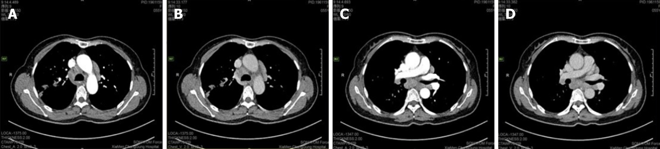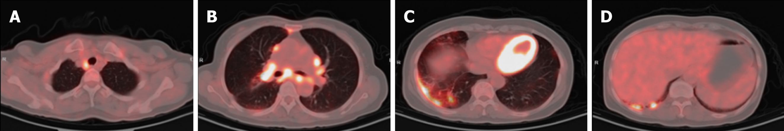 Case 2: Initial contrast-enhanced chest CT at a local hospital revealed multiple enlarged lymph nodes in the right supraclavicular fossa, mediastinum, and bilateral hilar regions (some poorly demarcated from the mid-esophagus), bilateral pulmonary nodules, right bronchial dilation with acute/chronic infection, and localized right pleural thickening (Figure 5). Subsequent PET-CT (December 11, 2024) demonstrated the following symptoms (Figure 6): (1) Widespread hypermetabolic lymphadenopathy (bilateral supraclavicular, mediastinal, hilar, internal mammary, abdominal, and retroperitoneal nodes; SUVmax 8.16; (2) Nasopharyngeal thickening with hypermetabolism; (3) Bilateral hypermetabolic pulmonary consolidations with interstitial changes (prominent in the right upper lobe posterior segment); (4) T11 vertebral focal hypermetabolism (no CT evidence of bone destruction); and (5) Splenomegaly (normal metabolism).