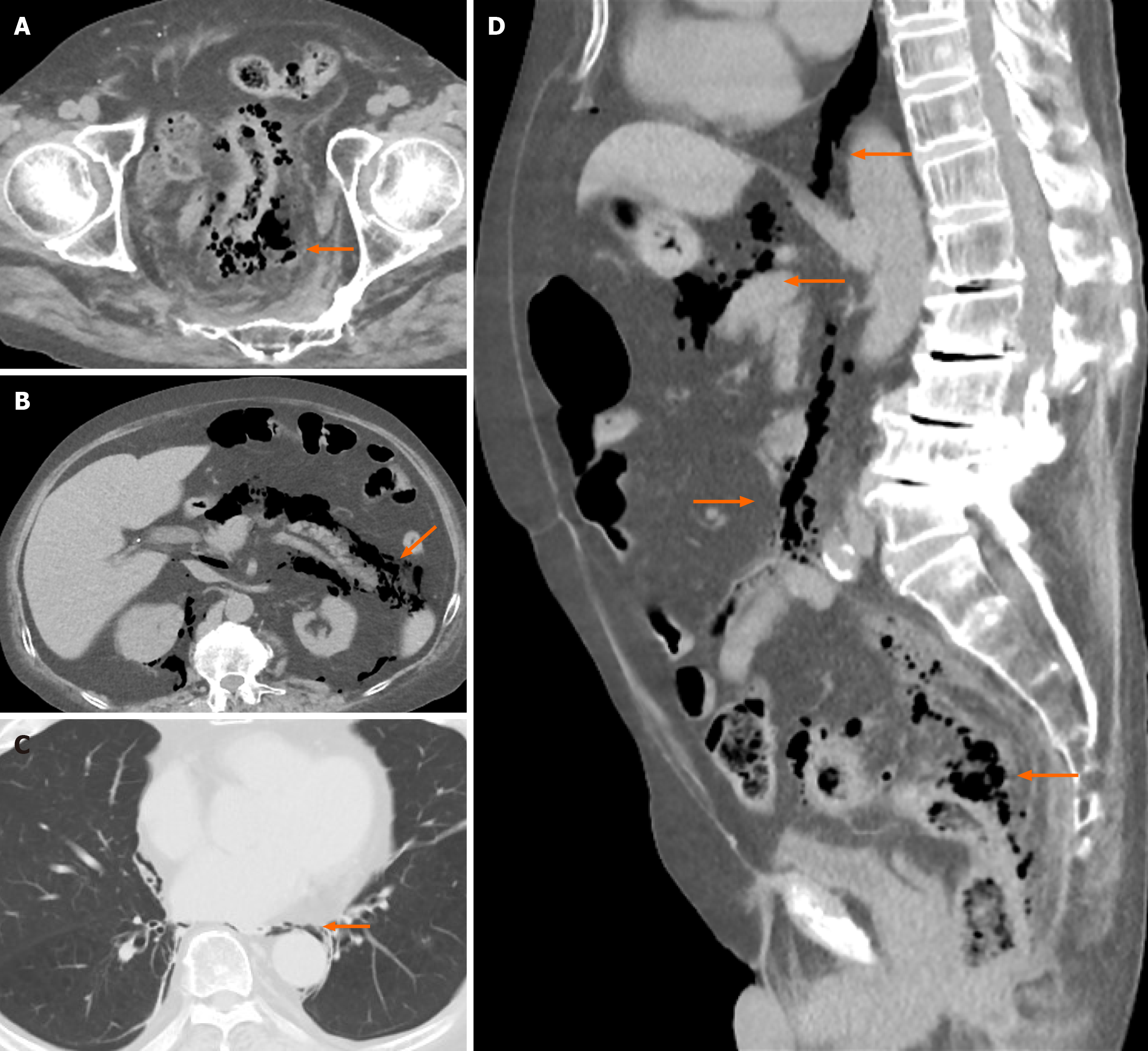 Abdominal computed tomography (CT) was performed with intravenous contrast. Axial, sagittal and coronal reconstructions were obtained. The CT examination revealed mural changes including focal wall thickening and edematous changes at the rectosigmoid junction. The extramural findings were peripheral fat stranding around the affected segment, diffuse pneumoretroperitoneum around the pancreas and kidneys, minor pneumoperitoneum, and pneumomediastinum (Figure 1).