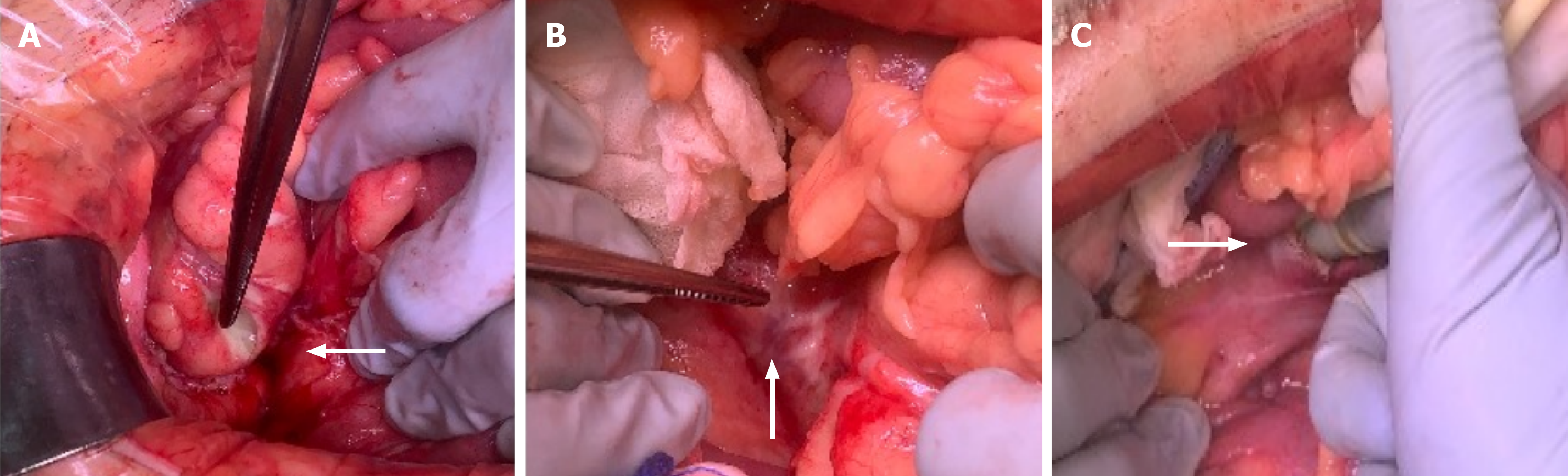 Because intra-abdominal infection caused by hollow organ perforation was suspected, an exploratory laparotomy was arranged immediately. During the procedure, the abdominal cavity was confirmed to be clean without contaminated ascites. However, mild necrosis and an unpleasant odor were identified in the mesocolon tissue near the sacral prom
