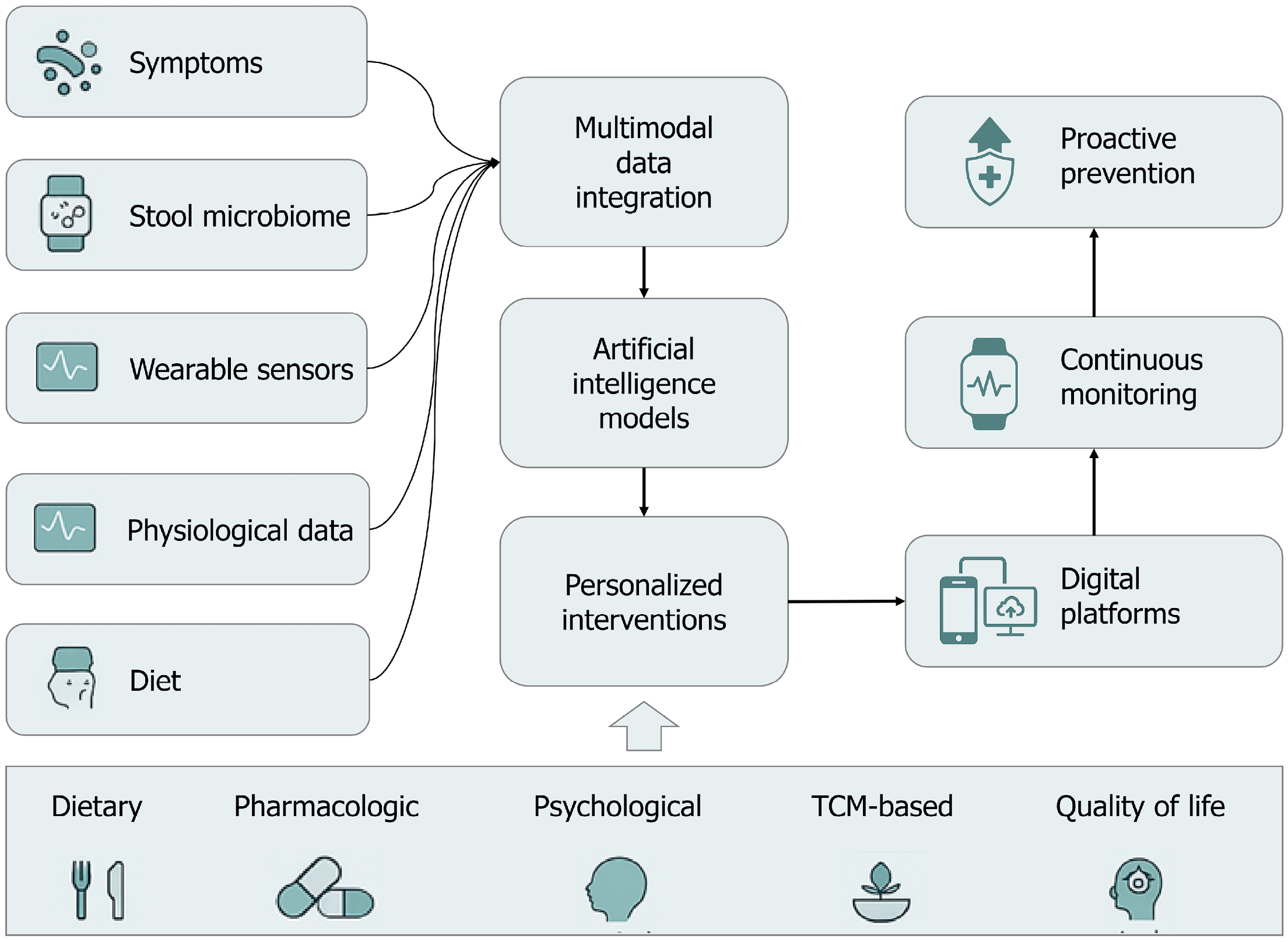 Figure 2 Artificial intelligence driven workflow for precision management and prevention of functional gastrointestinal disorders, integrating multimodal data, digital platforms, and personalized interventions including Western and traditional Chinese medicine.
