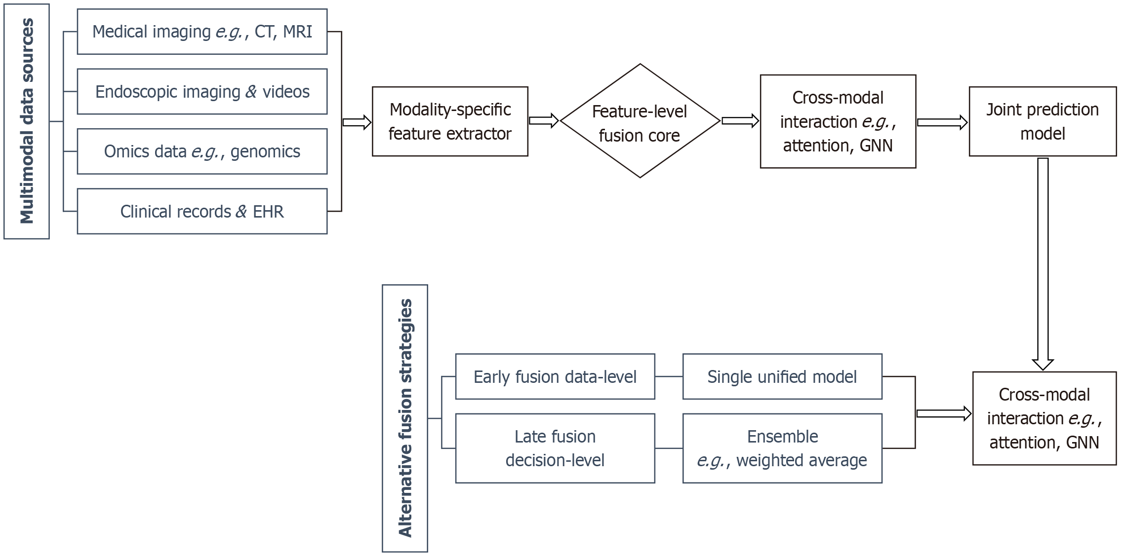 Figure 1 Schematic diagram of multimodal artificial intelligence fusion strategies for gastrointestinal tumors.