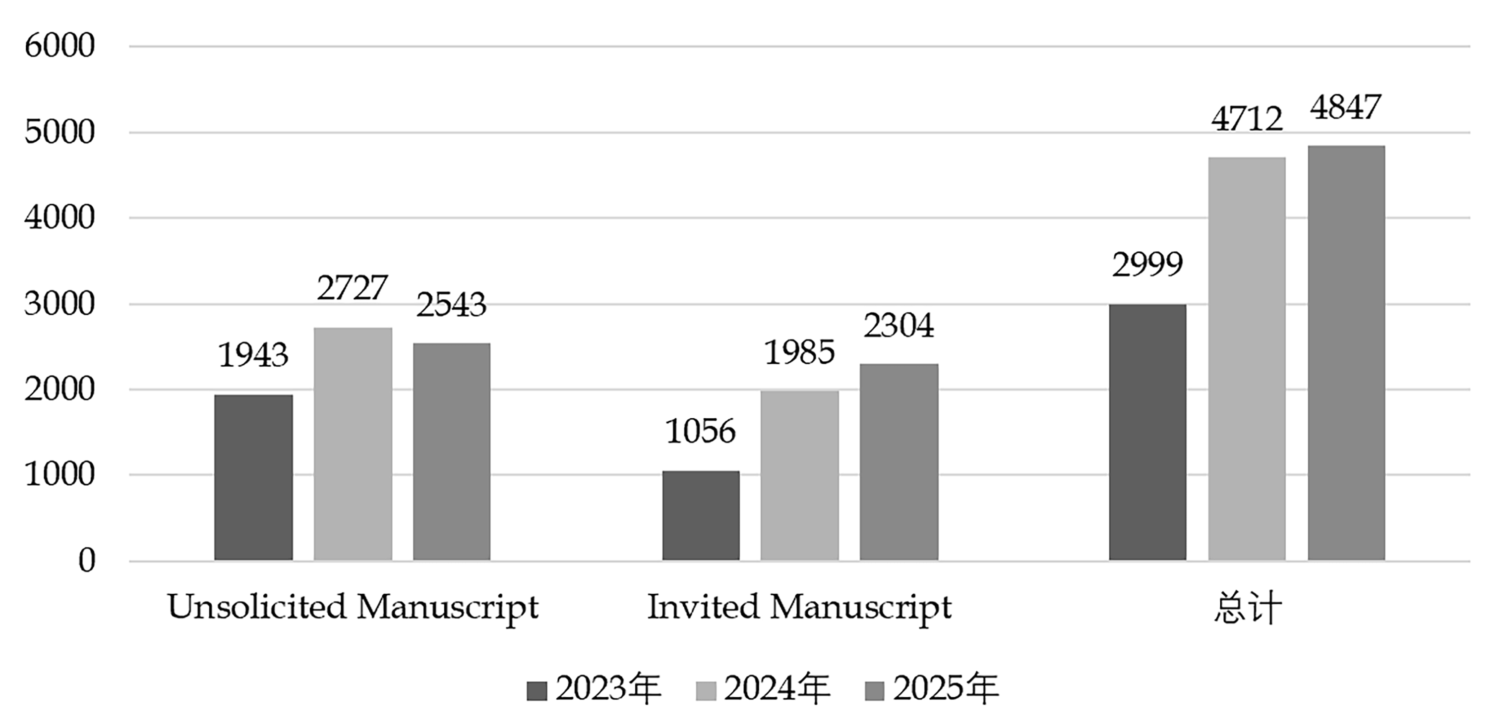 2025年1月1日至2025年12月23日,编辑部在2025年共完成4847篇手稿的第二次定稿工作,其中自由来稿2543篇(52.47%),约稿2304篇(47.53%)。同2023年和2024年数据相比(表2和图5),无论是自由来稿还是约稿,整体上均呈现增长趋势,尽管这种增长并非线性。