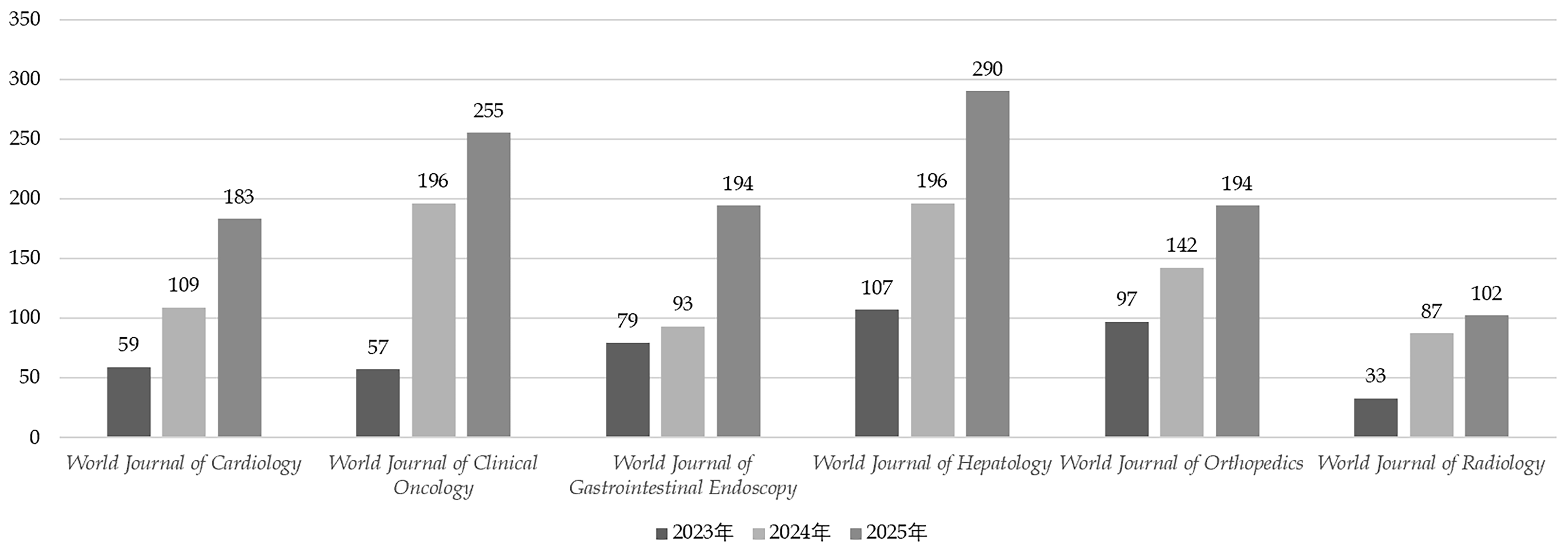 2025年6本SCIE收录期刊分别为World Journal of Diabetes (WJD)、WJG、World Journal of Gastrointestinal Oncology (WJGO)、World Journal of Gastrointestinal Surgery (WJGS)、World Journal of Psychiatry (WJP)和World Journal of Stem Cells (WJSC),所接受的约稿题目数量为1560篇,相比2024年的1150篇,增加了410篇;6本Emerging Sources Citation Index (ESCI)收录期刊分别为WJC、WJCO、World Journal of Gastrointestinal Endoscopy (WJGE)、WJH、World Journal of Orthopedics (WJO)和World Journal of Radiology (WJR),所接受的约稿题目数量为954篇,相比2024年的518篇,增加了436篇。另有7本正在申请ESCI收录的期刊,2025年已接受约稿1084篇,较2024年接受的1105篇基本持平;但相比2023年的512篇,增幅达到112%。