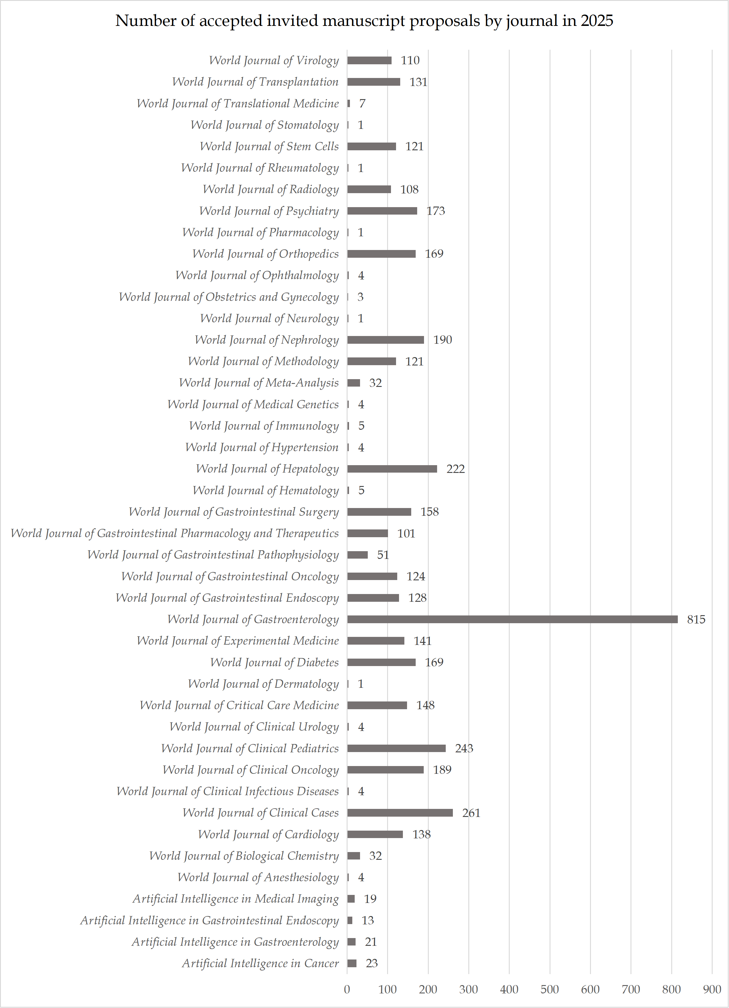Among the 4200 accepted invited proposals across the 46 English-language journals in 2025, the five journals with the highest number of accepted invitations were (in descending order): WJG, 815 (19.40%); World Journal of Clinical Cases (WJCC), 261 (6.21%); World Journal of Clinical Pediatrics (WJCP), 243 (5.79%); World Journal of Hepatology (WJH), 222 (5.29%); and World Journal of Nephrology (WJN), 190 (4.52%). Notably, World Journal of Otorhinolaryngology, World Journal of Surgical Procedures, and World Journal of Respirology received no invited proposals during the year (Figure 2).