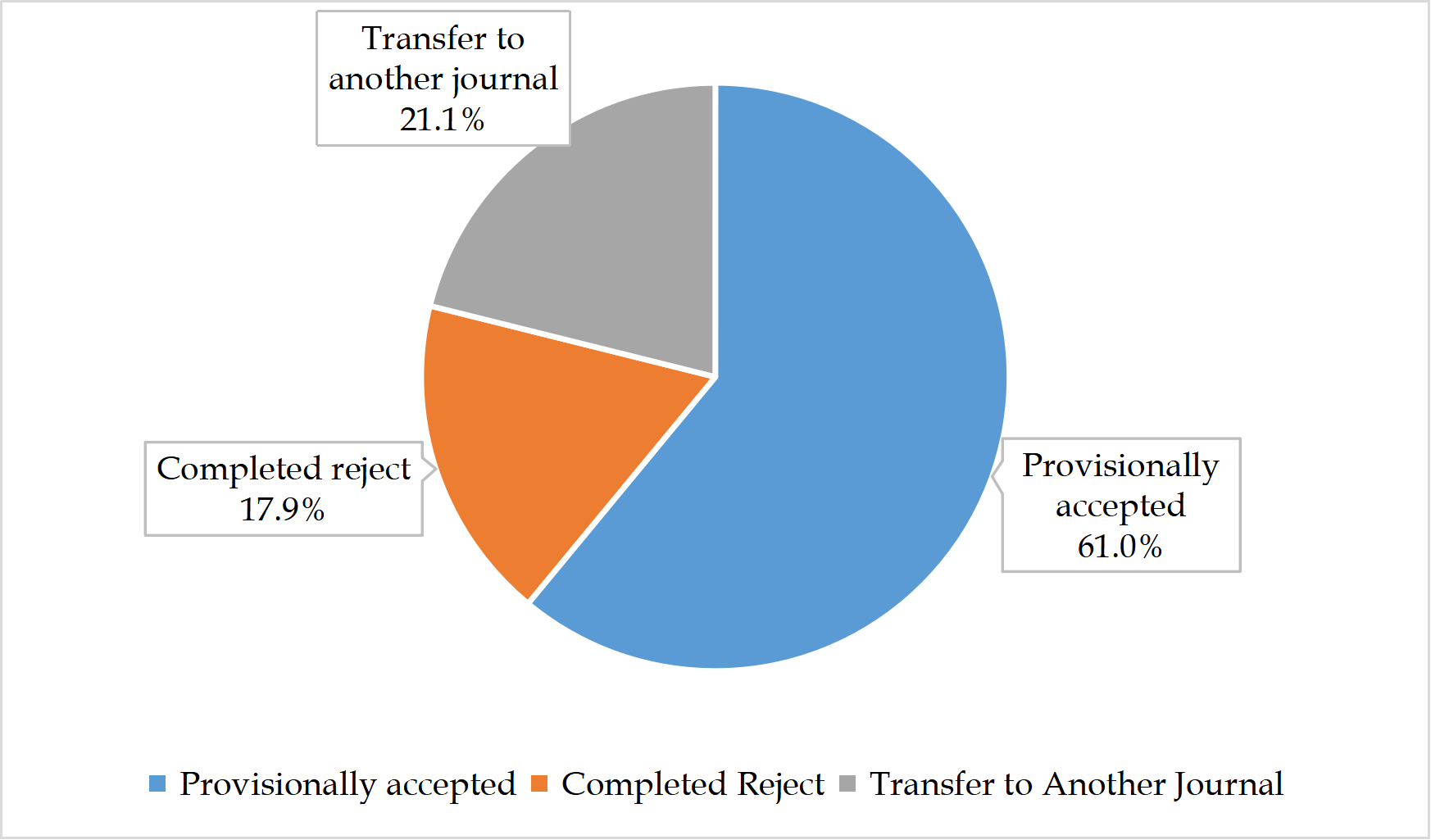 Between January 1 and December 26, 2025, a total of 8431 manuscripts reached a first decision across BPG’s 46 English-language journals. This comprised 3462 (41.1%) invited submissions and 4969 (58.9%) unsolicited ones. The outcomes of first decision were as follows (Figure 4): 5142 (61.0%) manuscripts were provisionally accepted; 1780 (21.1%) were recommended for transfer to another journal; and 1509 (17.9%) were rejected.