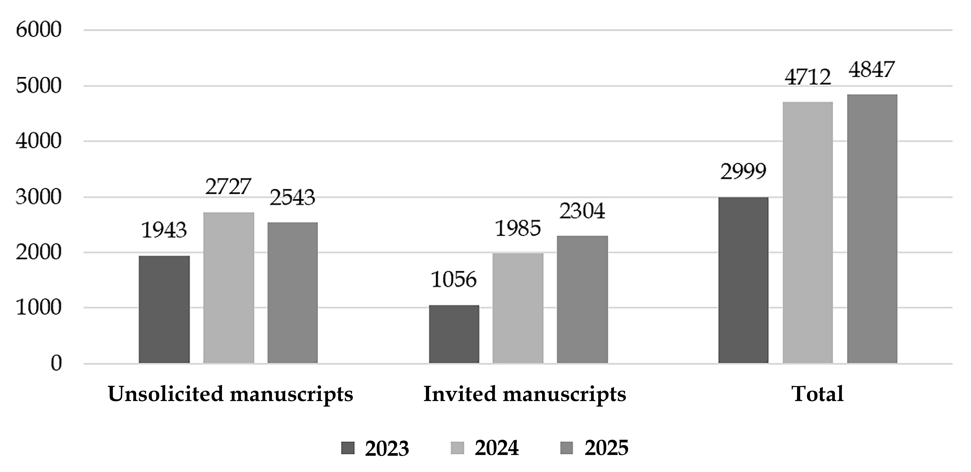 Notable shift in composition: The share of invited manuscripts increased from 35.2% in 2023 to 47.5% in 2025, indicating a strategic editorial emphasis on active solicitation.