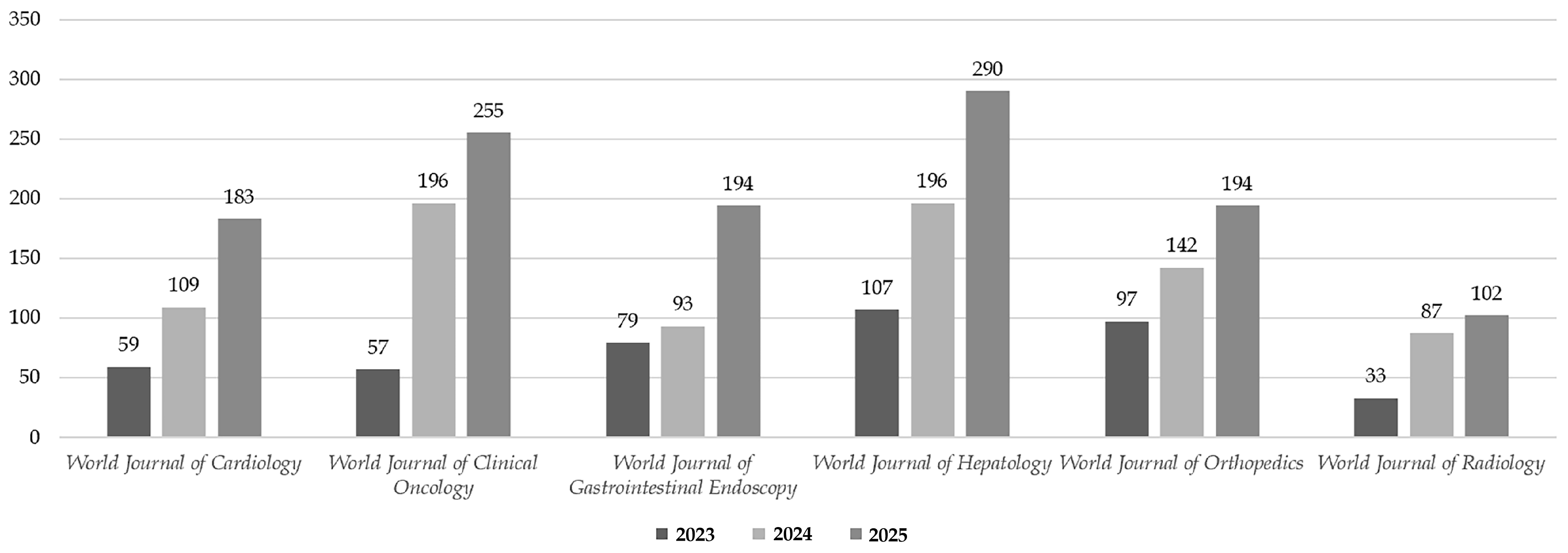 WJH and WJCO showed significant growth, reaching 290 and 255 articles in 2025, respectively, approaching the scale of SCIE-indexed journals. WJC grew from 59 to 183 articles, an increase of 210%, representing the fastest growth rate among the ESCI-indexed journals. WJR had the lowest baseline but still increased from 33 to 102 articles over three years (growth of 209%), indicating a rapid start-up phase. WJGE grew from 93 articles in 2024 to 194 in 2025, a 108.6% increase. WJO maintained steady growth, rising from 97 articles in 2023 to 194 in 2025.