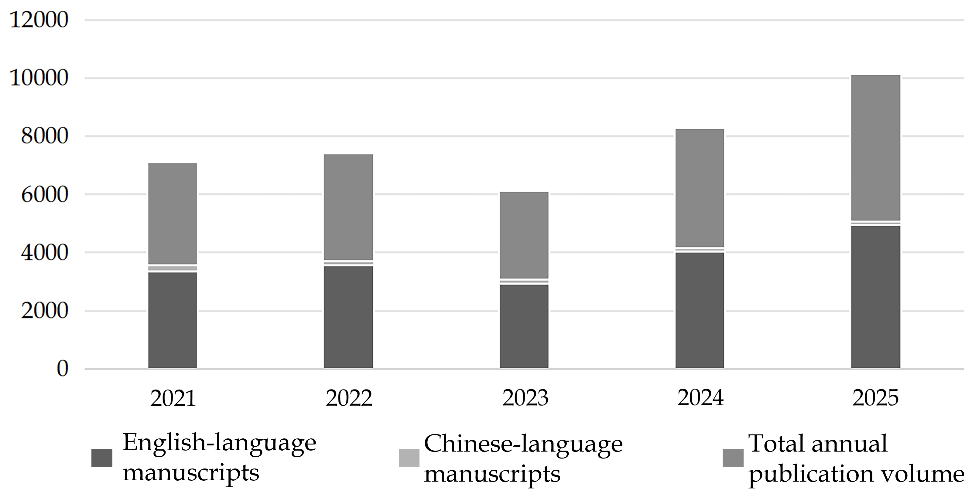 BPG currently publishes 46 English-language journals and 1 Chinese-language journal. In 2025, the Production Department produced and published 5062 articles, comprising 4942 English-language manuscripts and 120 Chinese-language manuscripts. Compared with 2021-2024, the publication volume shows a steady growth trend (Figure 8).
